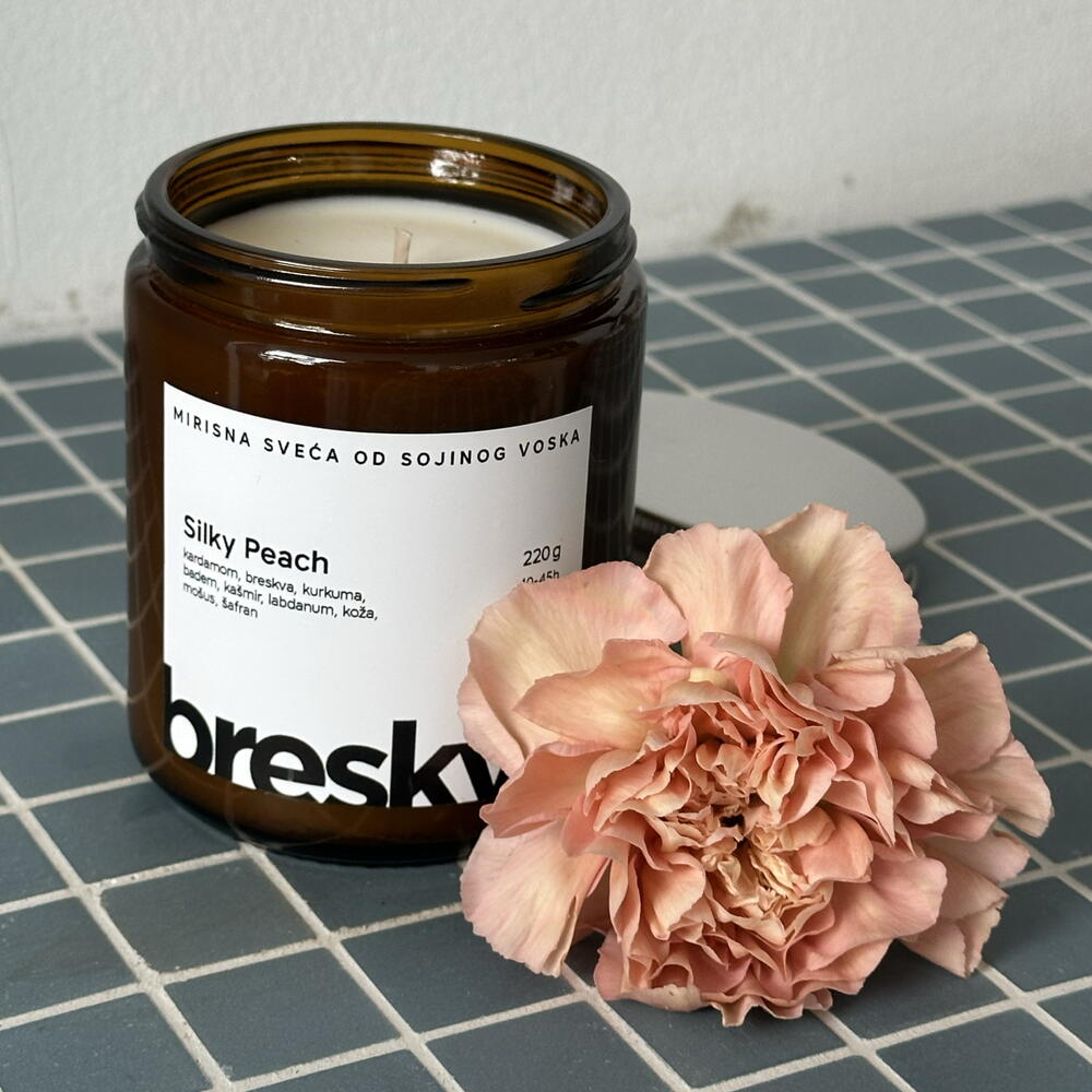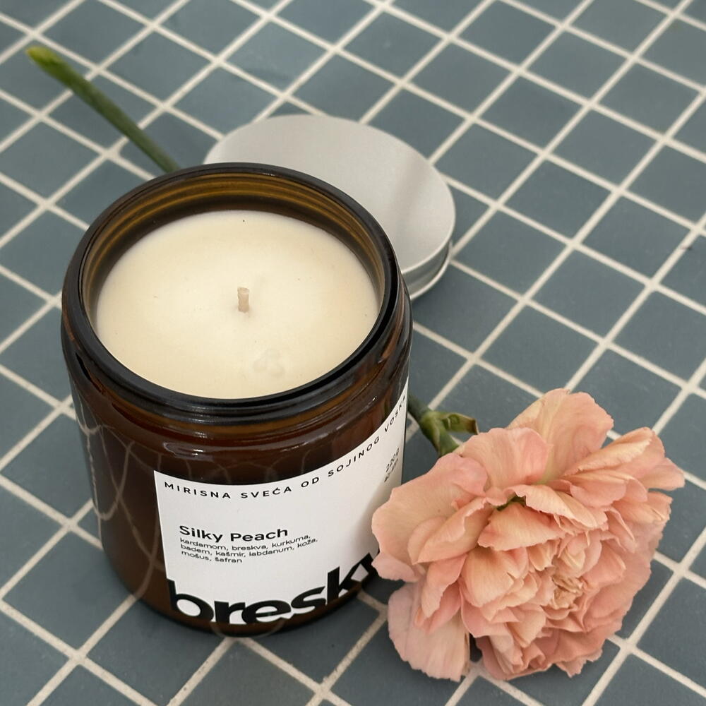 Scented candle from the brand Breskva, 220g Burning time: 40-45 hours The scent can be chosen based on your preference: softer or more intense. Send us your preferences, and we will help you choose: Silky Peach Lemon pop Velvet Woods Minty Oasis Gin Tonic Coastal escape Citrus Tobacco