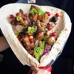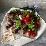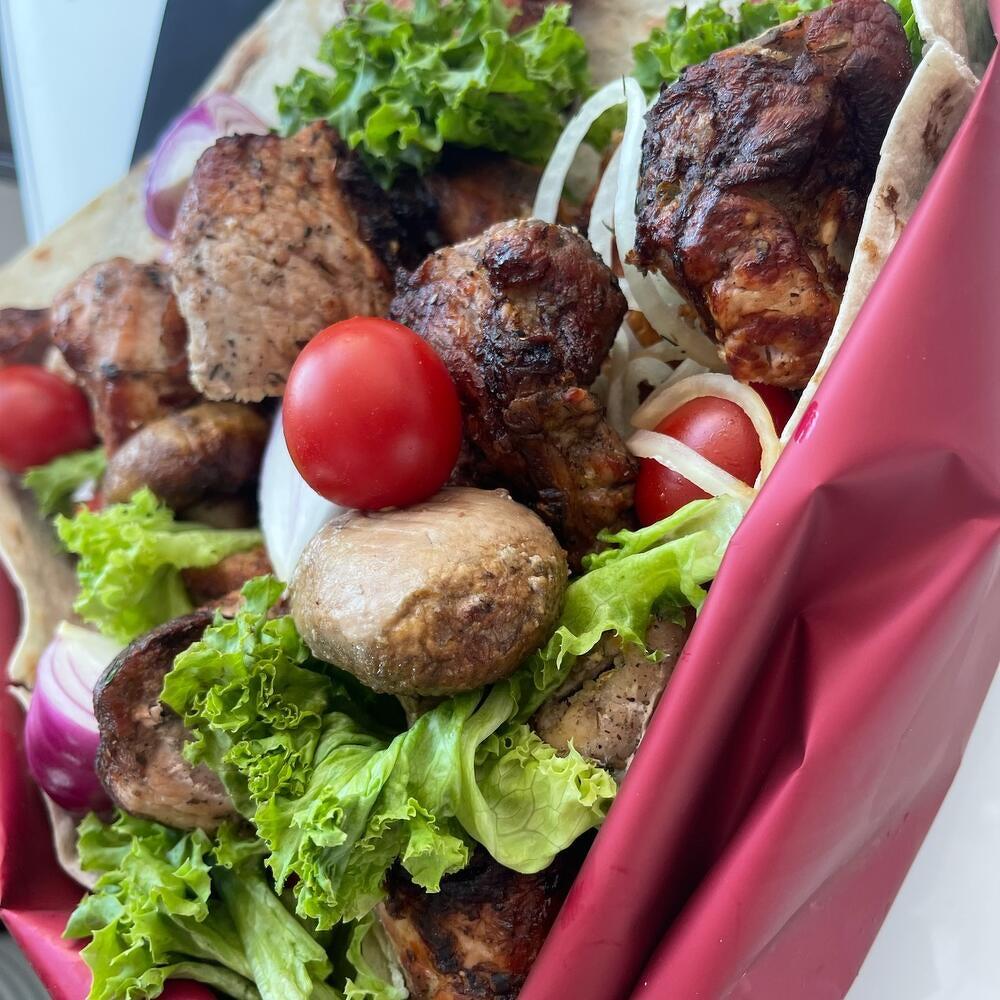 Упаковка дизайнерська - 1 шт. Лист салату - 1 шт. лаваш тонкий - 1 шт. черрі помідори - 70 гр. лучок - 2 шт. гриби печериці з мангала - 7 шт. курица - 200 гр. свинина - 200 гр.