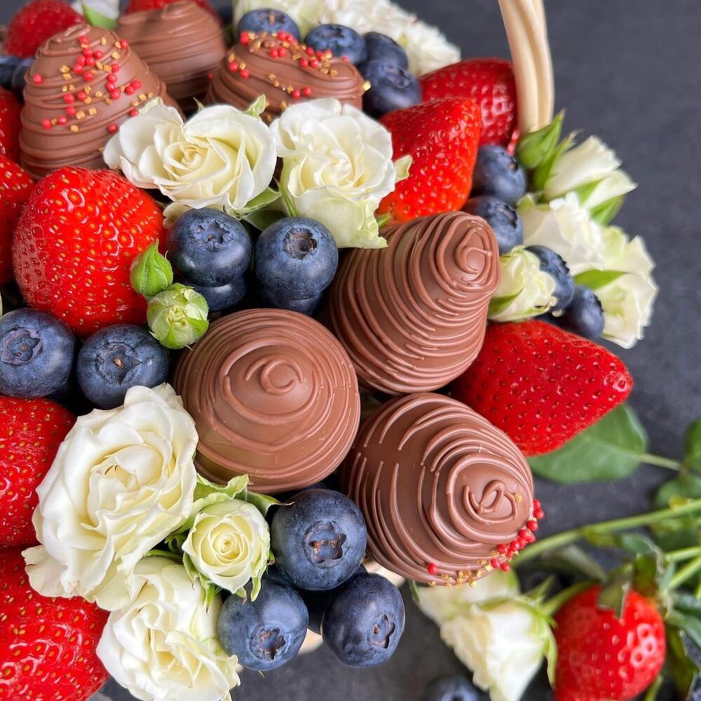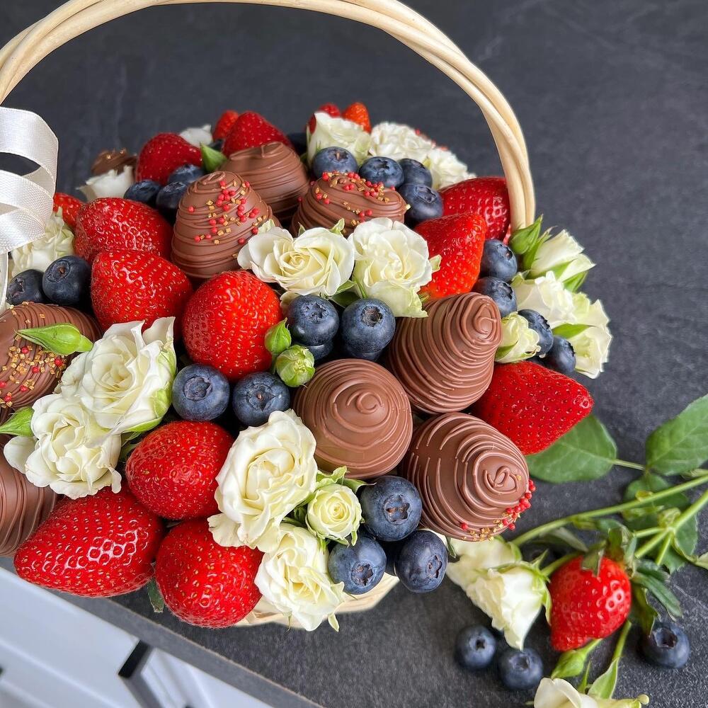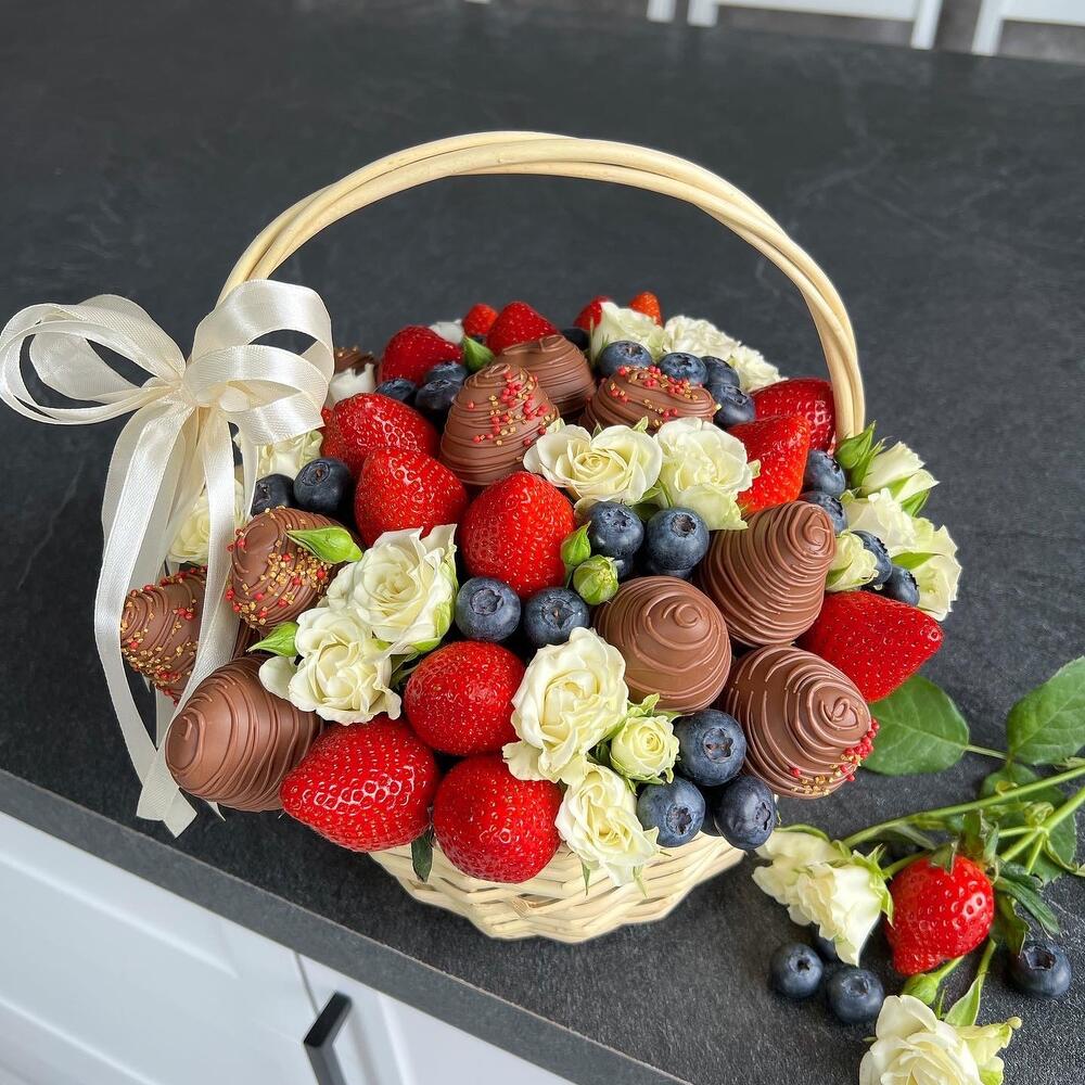wicker basket - 1 шт. blueberry - 250 гр. свіжа полуниця - 500 гр. chocolate covered strawberries callebaut (belgium) - 10 шт. білі кущові троянди - 9 шт.