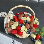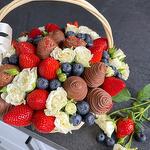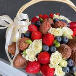 Beautiful wicker basket with fresh berries, chocolate covered strawberries and bush roses.