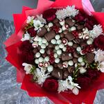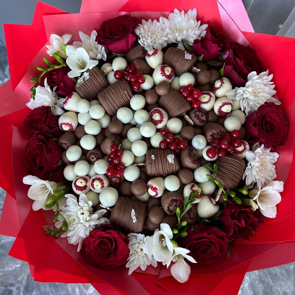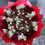 Chrysanthemum - 5 шт. Freesia - 5 шт. rose - 10 шт. banana - 200 гр. raspberry - 150 гр. бельгійський шоколад - 600 гр. bluberries - 200 гр. red currant - 50 гр.