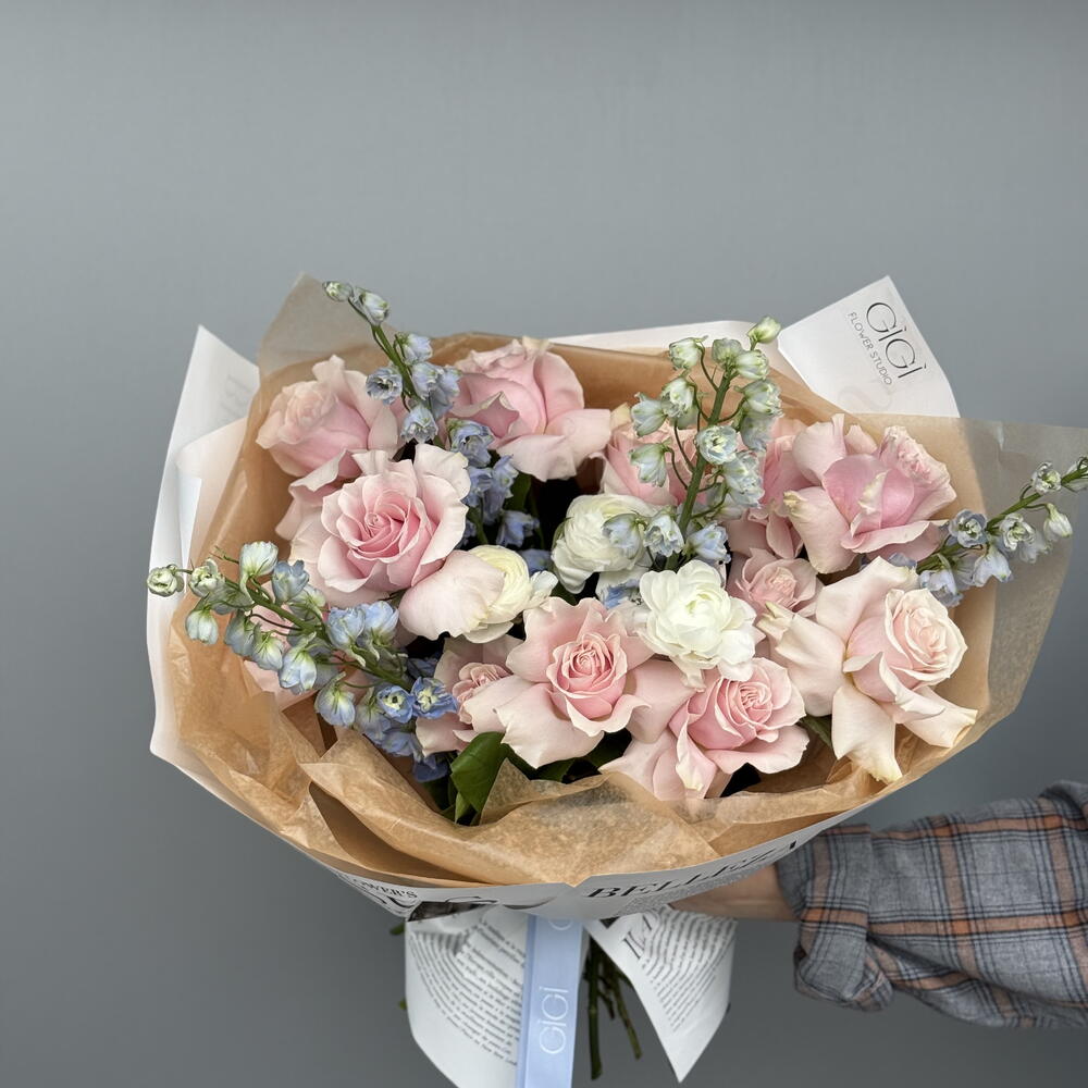 ranunculus - 3 шт. delphinium - 4 шт. french rose - 12 шт.