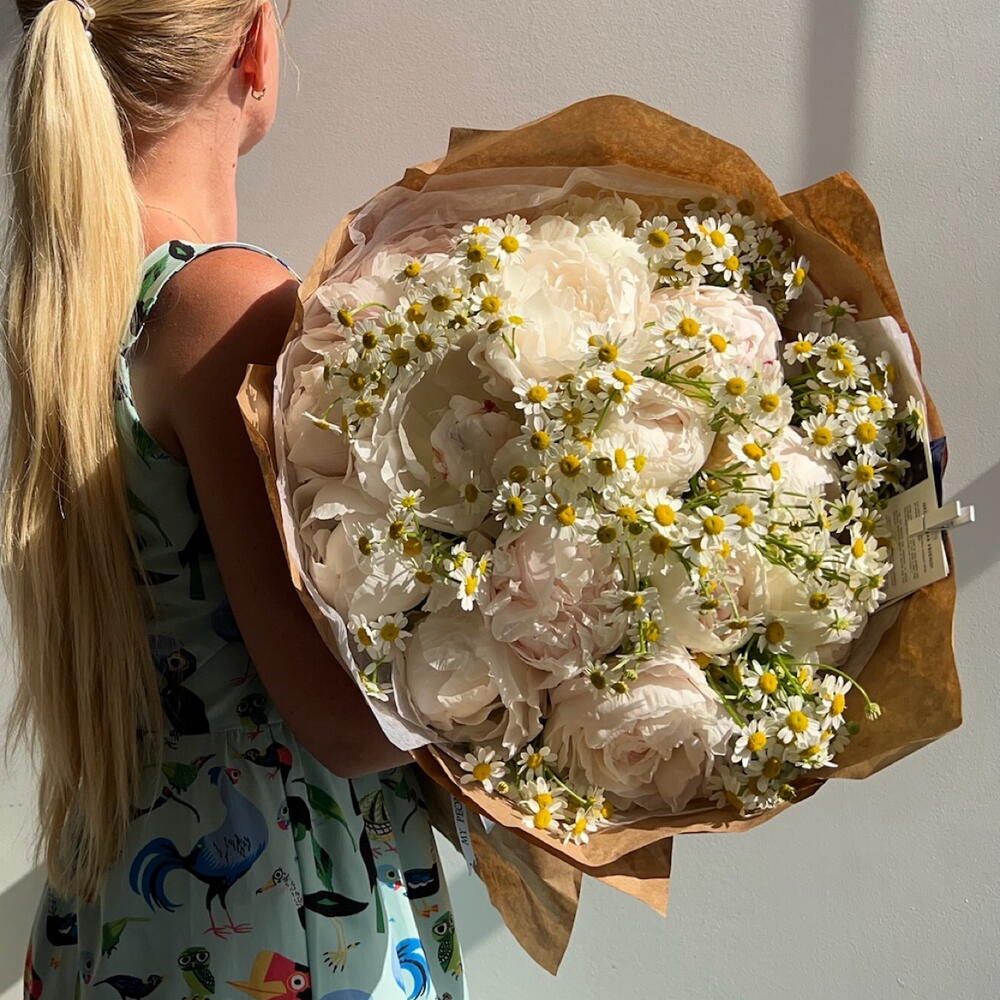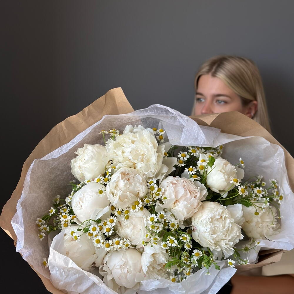 Discover the charm of our Florists Special bouquet, thoughtfully designed to impress. This hand-crafted arrangement features a harmonious blend of 10 delicate peonies, complemented by a bounty of 15 charming chamomiles. Each flower is carefully selected for its beauty and freshness, promising an enchanting spectacle of color and fragrance. Perfect for any occasion, or simply to brighten up a space, this bouquet brings natures treasures right into your hands.
