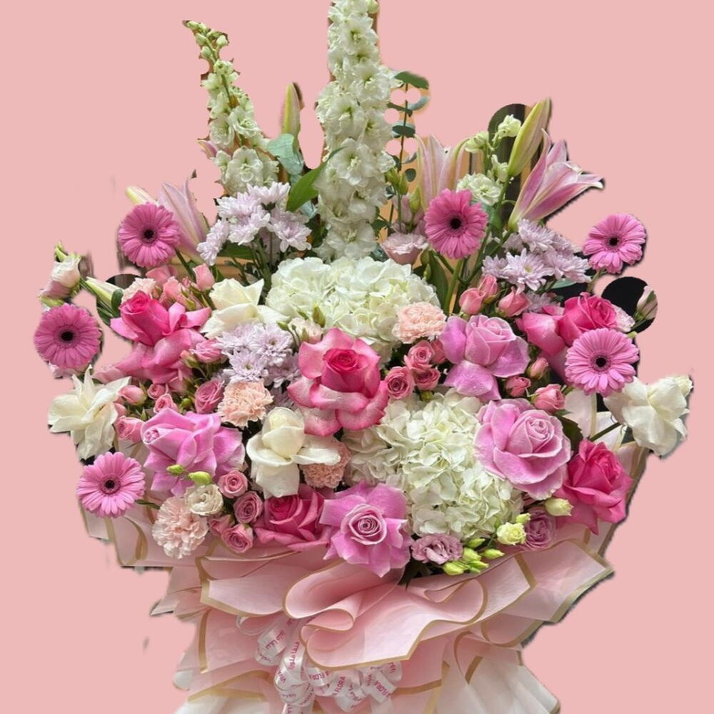 A stand arrangement with a mix of flower bouquets a perfect gift for the bride