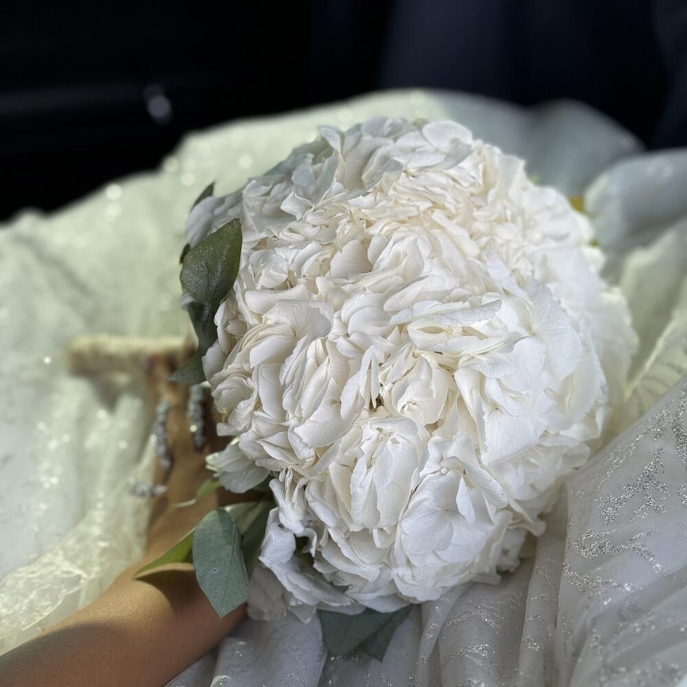 Этот элегантный букет невесты из трех великолепных гортензий идеально подойдет для создания неповторимого образа в ваш особенный день.