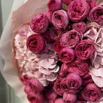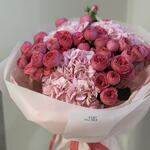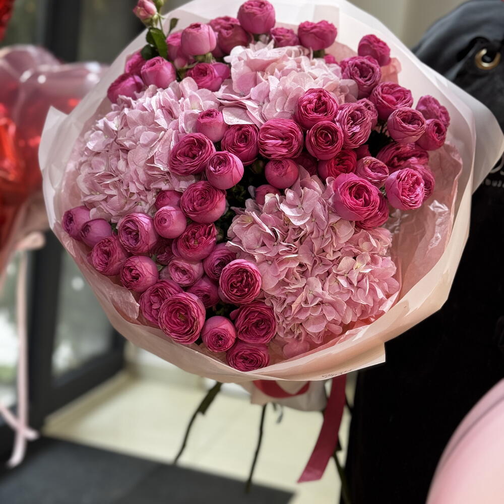 Ефектний букет у відтінках пудрового рожевого і інтенсивної малини, що поєднує пухнасту гортензію з елегантними трояндами Silva Pink. Розкішна, виразна композиція романтичного характеру — ідеальна для особливих випадків та важливих моментів.