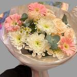 Gerbera - 3 шт. ромашка - 1 шт. eukaliptus - 2 шт. róża gałązkowa - 1 шт. chryzantema - 1 шт.
