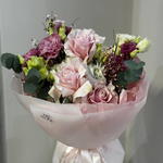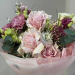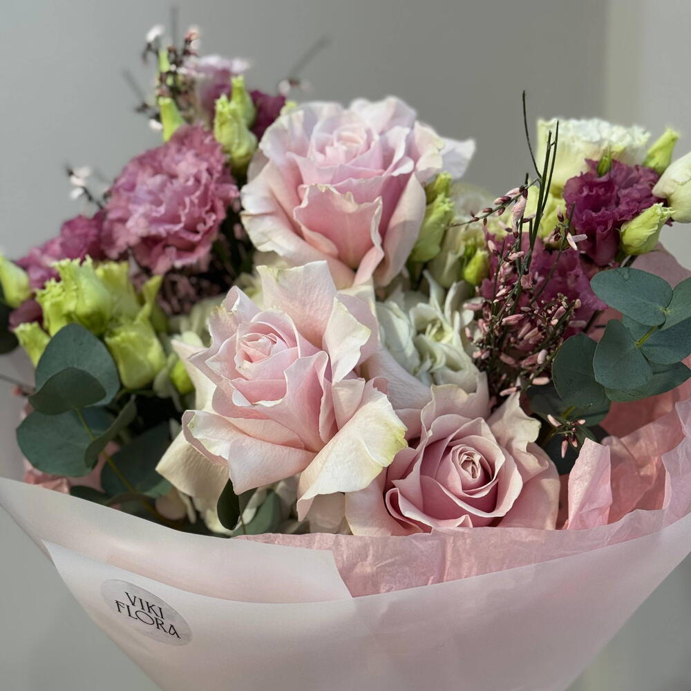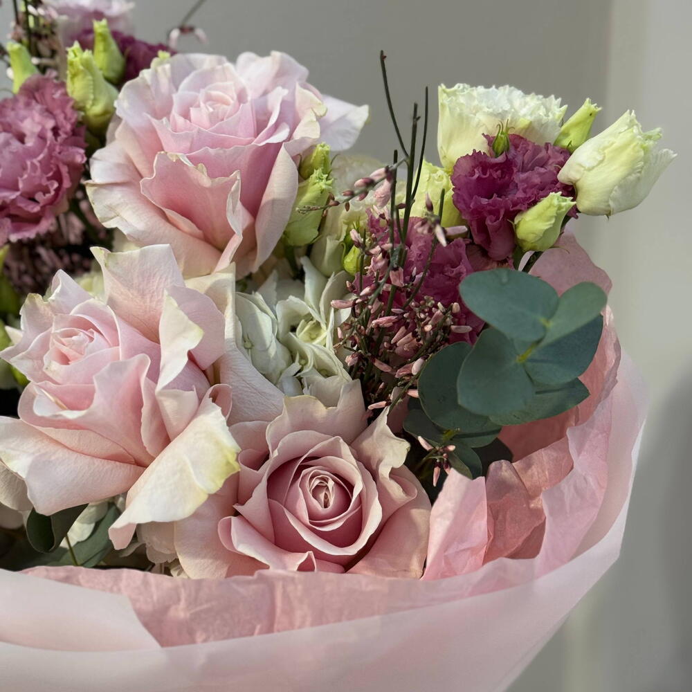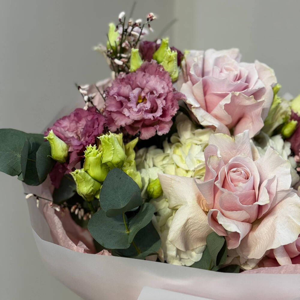 Делікатний букет у відтінках рожевого і білого з французької троянди Mondial, еустоми, гортензії та евкаліпта. Виконаний вручну з преміальних квітів, упакований в елегантну, світлорожеву упаковку.