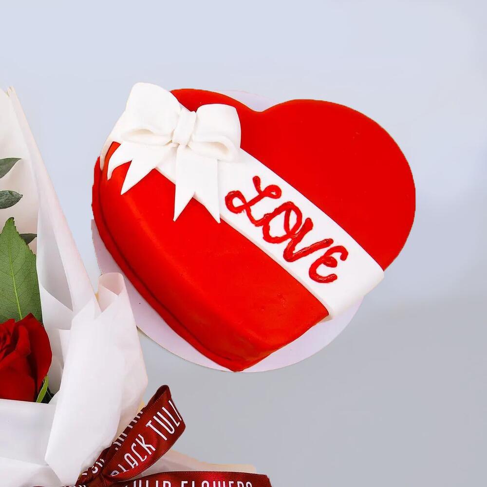Cutie bouquet - 6 red roses and heart shaped cake a best treat for your loved one.