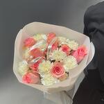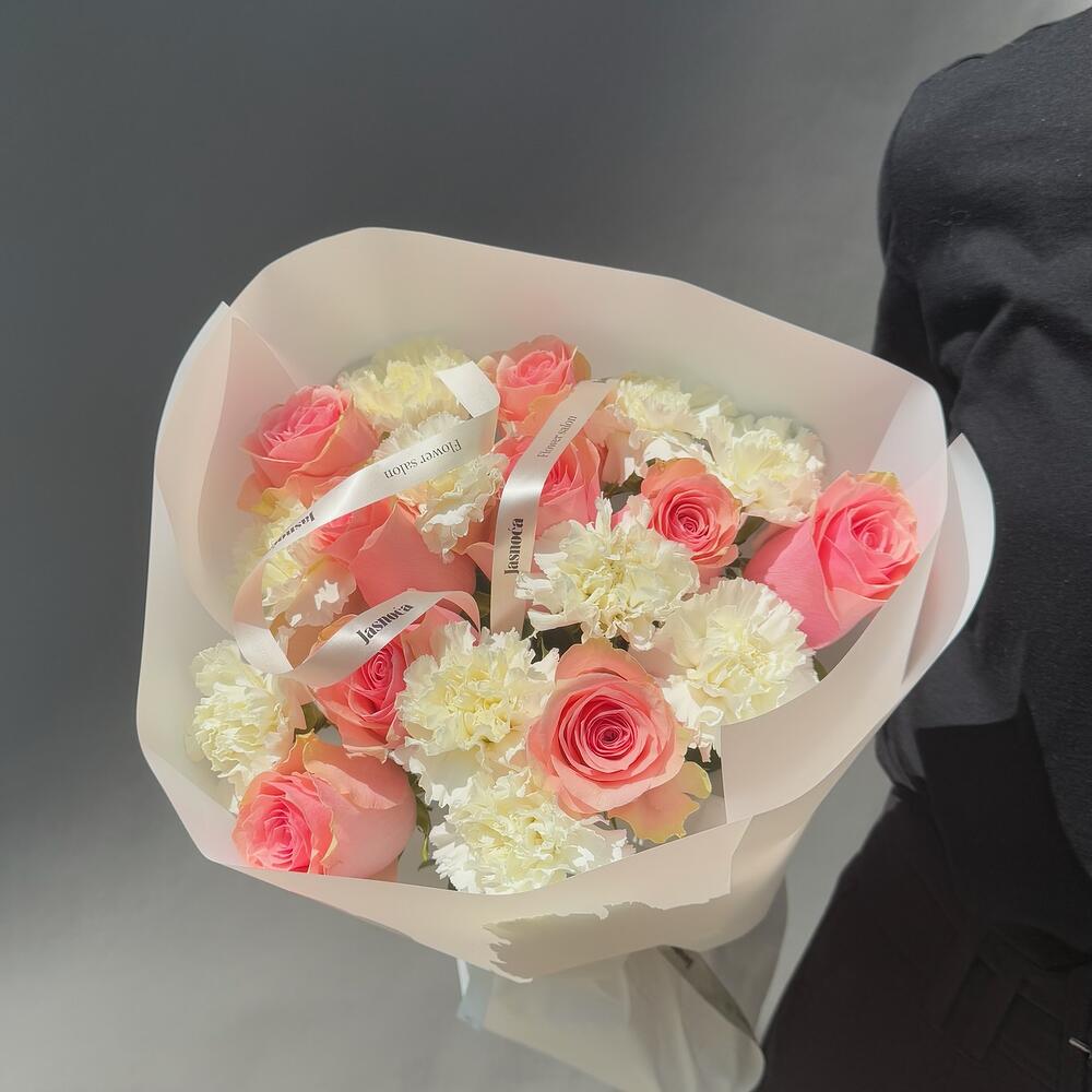 Beautiful duo bouquet featuring white dianthus and pink roses in size L. Perfect for any occasion. The shade of the roses may vary due to seasonal availability. Bouquet sizes are approximate. What you get: • A detailed care guide to help your flowers last longer • Flower food to preserve freshness up to 5-7 days • A gift bag for safe delivery