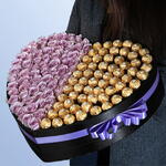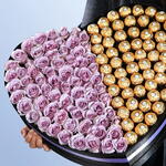 This box arrangement consists of 70-75 Stems Purple Roses and 60-65 Ferrero Rocher Chocolates.