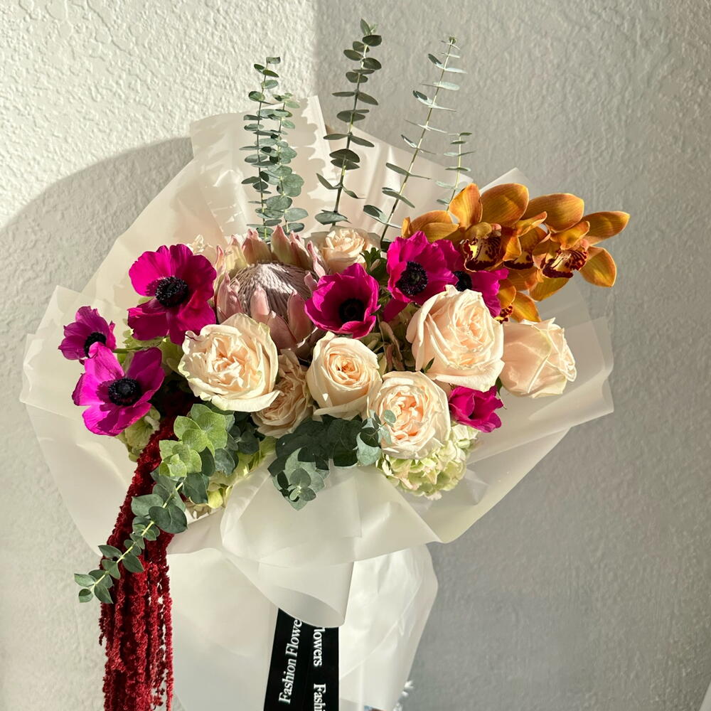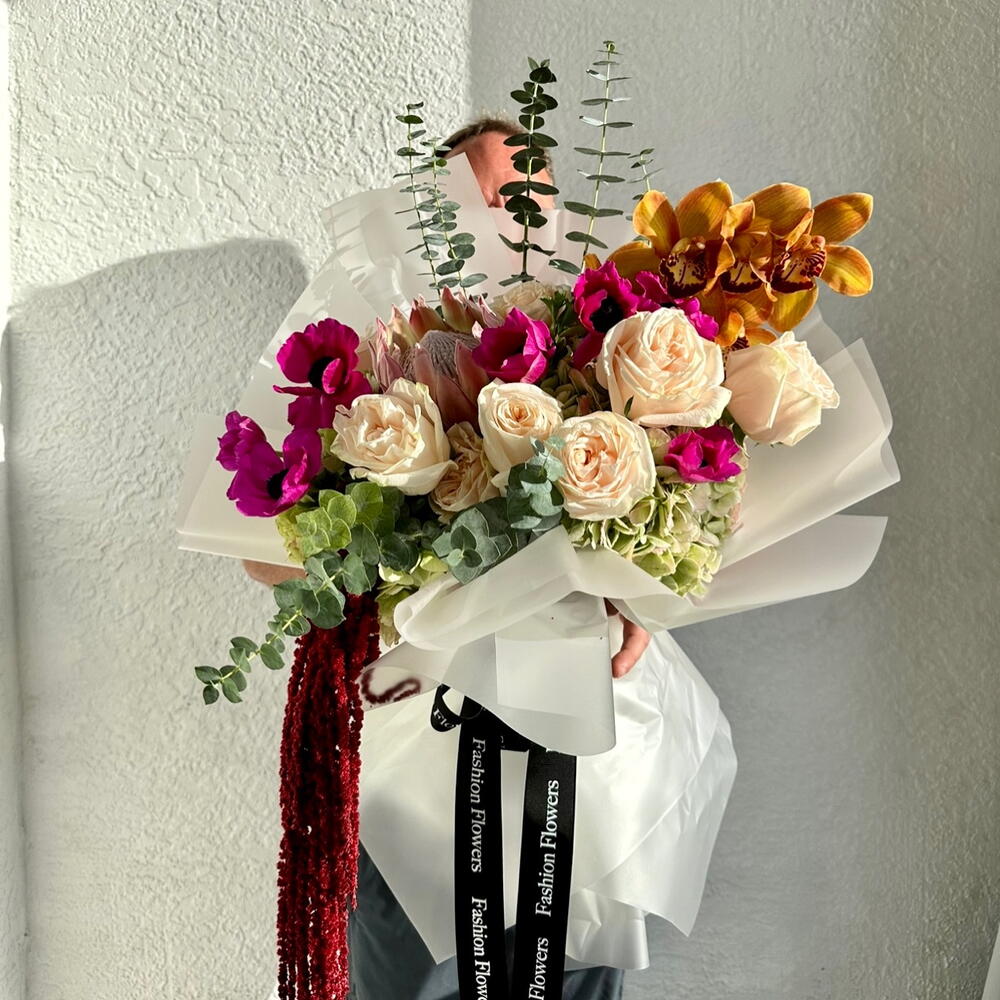 Анемон - 10 шт. Гортензія - 3 шт. Евкаліпт - 10 шт. Троянда - 10 шт. Цимбідіум - 1 шт.