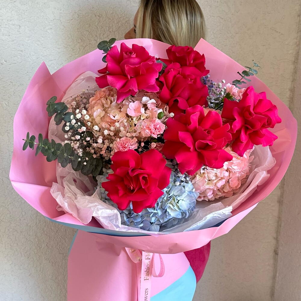 Гіпсофіла - 5 шт. Гортензія - 4 шт. Евкаліпт - 5 шт. Троянда - 7 шт.