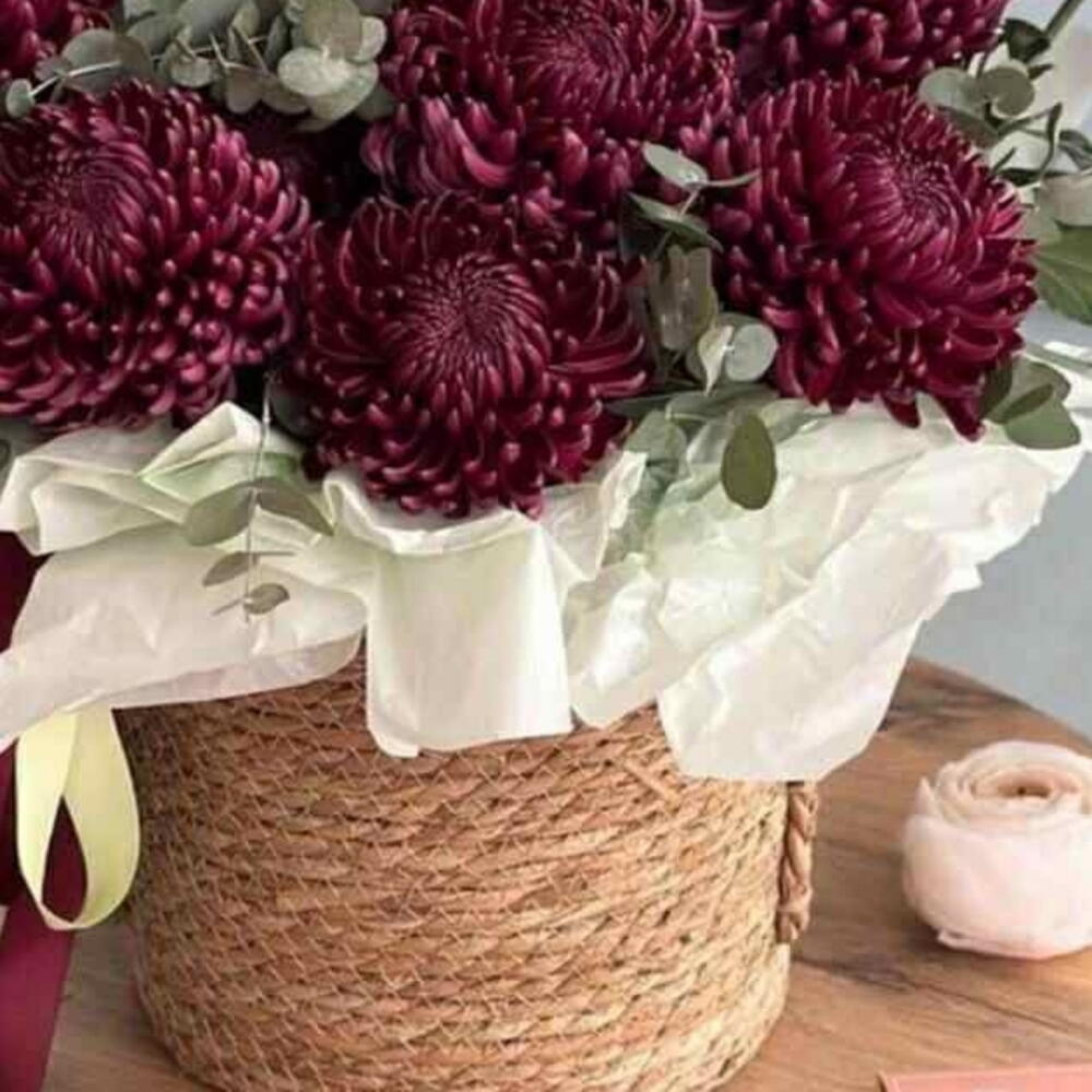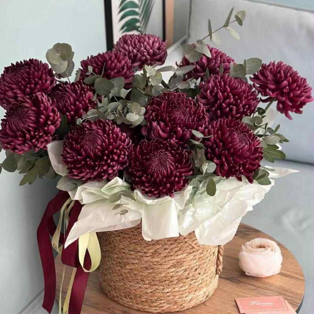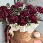Этот прекрасный подарок воплотит в себе искреннюю заботу и теплоту ваших чувств. Уникальный комплект из 19 крупные хризантем Бигуди сочной яркости сопровождается живописной зеленью эвкалипта в количестве 11 веточек. Всё это богатство пышной, свежести умело собрано в стильную корзину и аккуратно упаковано в кальку, которую украшают 2 элегантные ленты. Это композиция станет украшением любого помещения и подарит невероятное наслаждение от свежих цветов!