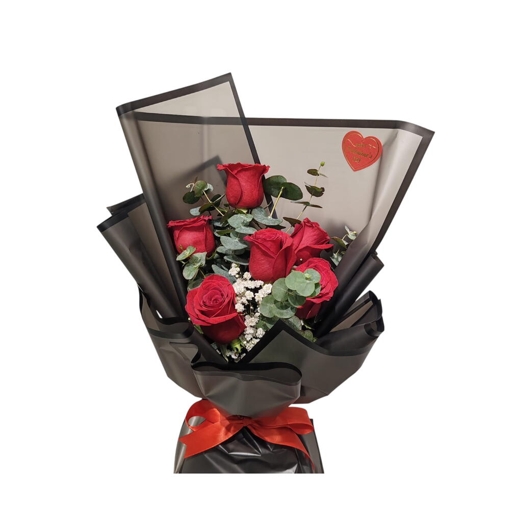 Red rose - 6 шт. Gypsophila - 3 шт. eucalypse - 8 шт.