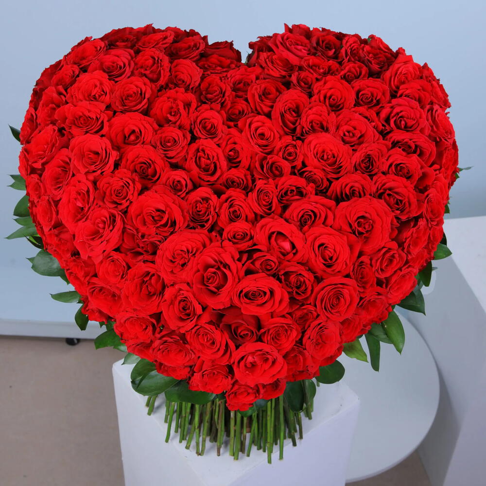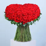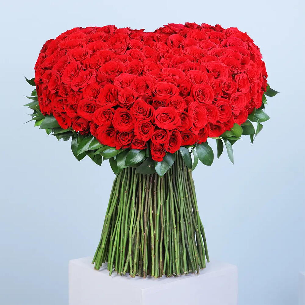 A breathtaking heart arrangement of Red rose stems with fresh Rescues leaves. 250 stem Red Rose and 3 bunch Rescues leave
