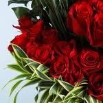 Elevate your space with our exquisite centerpiece featuring 70 stems of striking red roses gracefully adorned with lush leaves.
