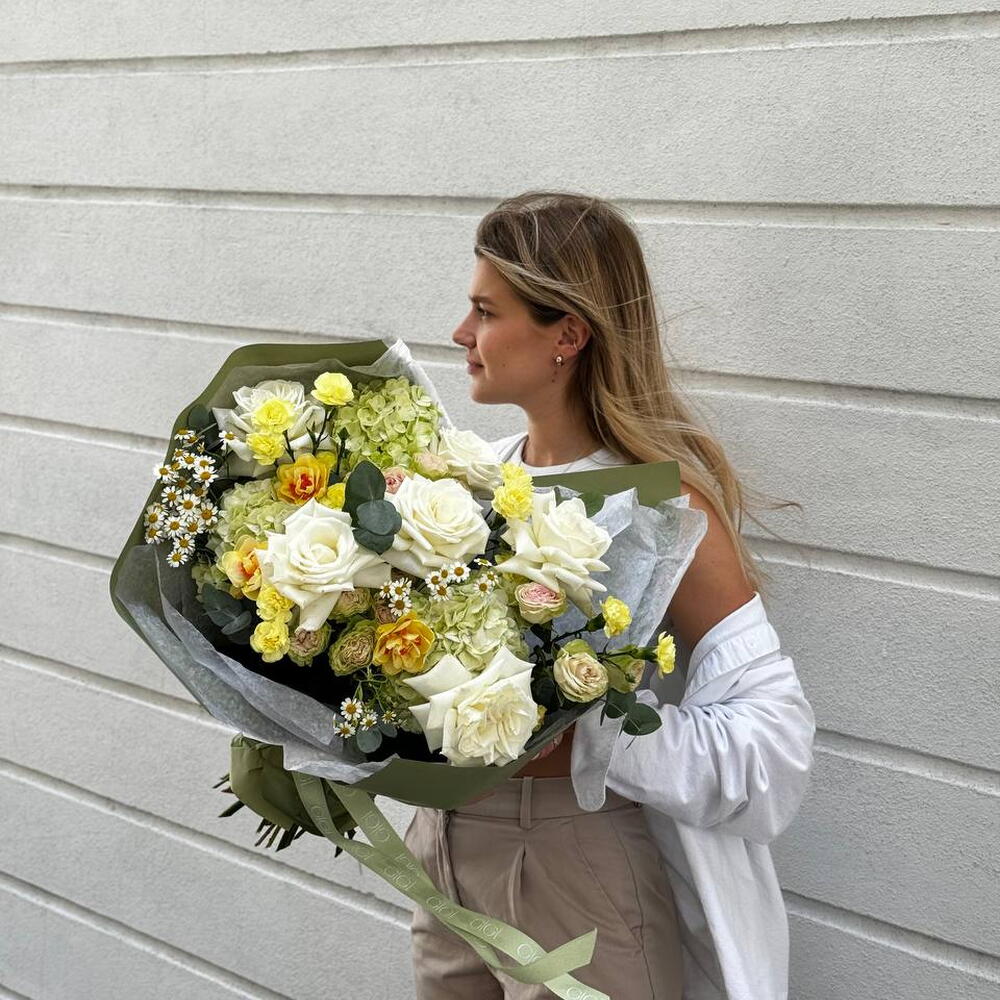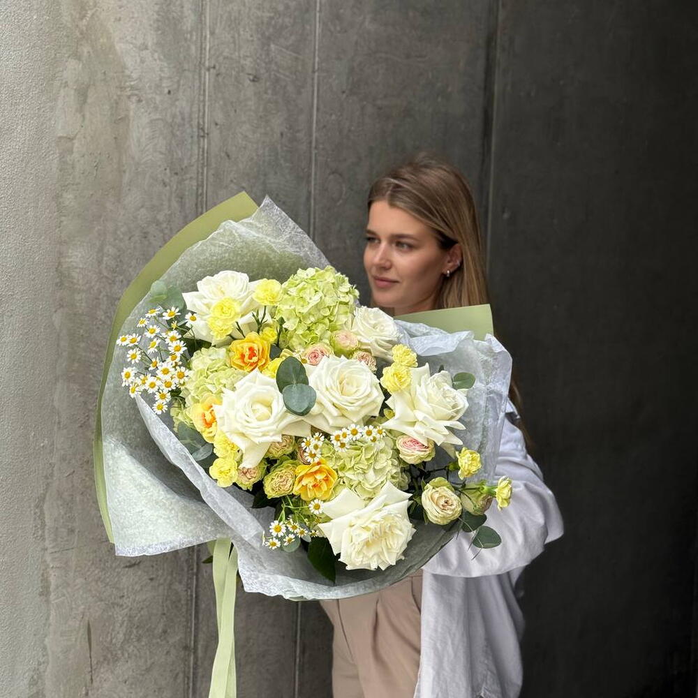 Eucalyptus - 3 шт. Hydrangea - 3 шт. carnations - 4 шт. garden rose - 2 шт. narcissus - 3 шт. ромашки - 3 шт. французькі троянди - 6 шт.