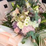 Satin ribbon - 2 шт. Eustoma - 7 шт. Eucalyptus - 5 шт. Hydrangea - 3 шт. Limonium - 5 шт. Chrysanthemum - 7 шт. carnation - 5 шт. wrapping paper - 20 шт. орієнтальні лілії - 5 шт. special flowers - 1 шт. robellini - 5 шт. roses - 10 шт. mixed greenery - 5 шт.