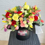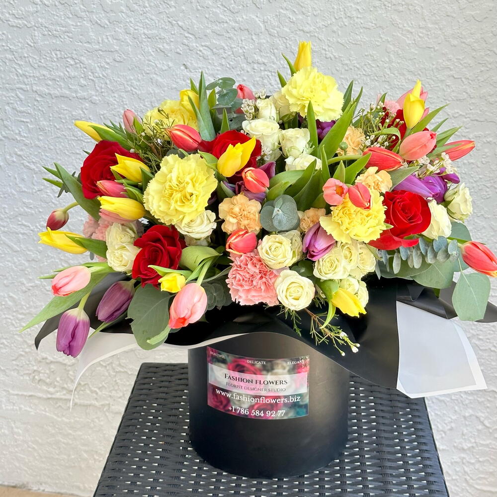 Eucalyptus - 10 шт. Tulip - 40 шт. rose - 5 шт. carnation - 10 шт. bush rose - 10 шт.