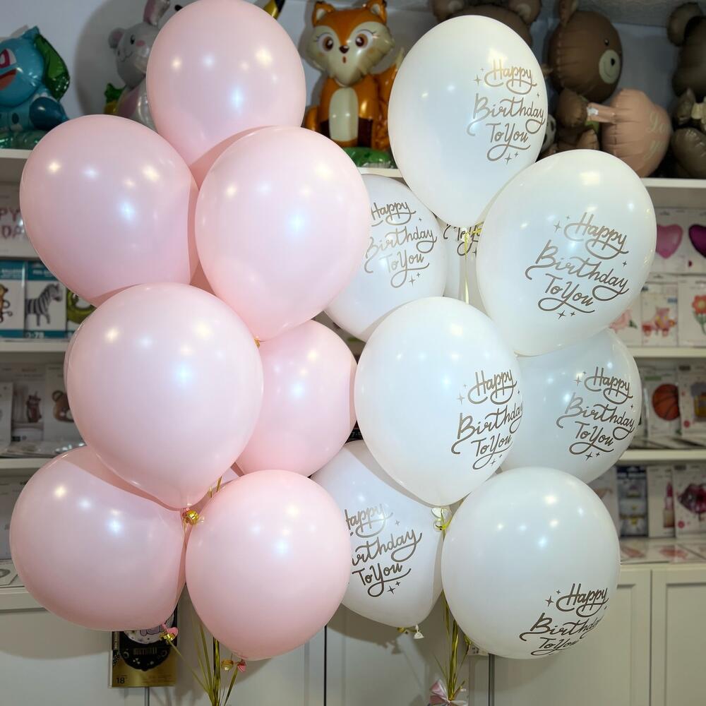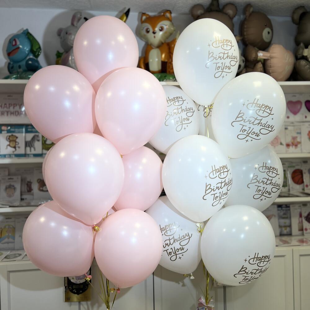 Zestaw składa się z 20 szt. balonów: -10 szt. Balon zwykły lateksowy biały z nadrukiem „Happy Birthday to You” -10 szt. Balon zwykły lateksowy jasnoróżowy macaron -2 szt. Obciążnik - 2 szt. Kokardka Balony są napełnione helem.