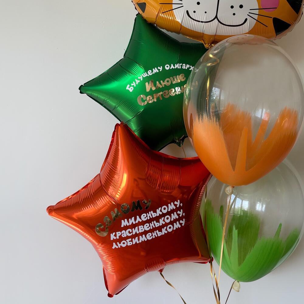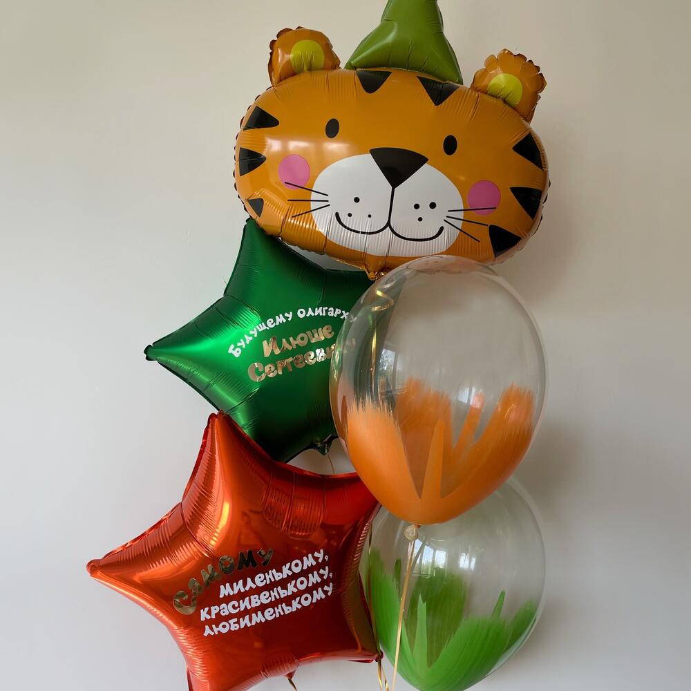 Милый набор воздушных шариков с тигрёнком станет прекрасным подарком как для ребенка. Красивое украшение для ваших праздничных фото. В наборе 2 латексных шара (30 см), 2 фольгированные звезды с индивидуальными надписями (45 см), фольгированная фигура Тигр в колпке (55 см). Оформите заказ и мы доставим подарок получателю в удобное время. Ваш праздник - наш главный приоритет! 🎁 Шары для мальчика, Шары для девочки, Шары для ребенка, Шары с животными, Шары с тиграми