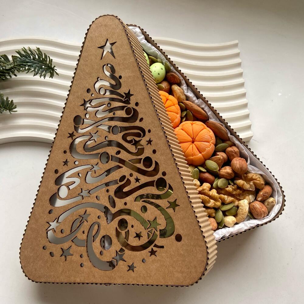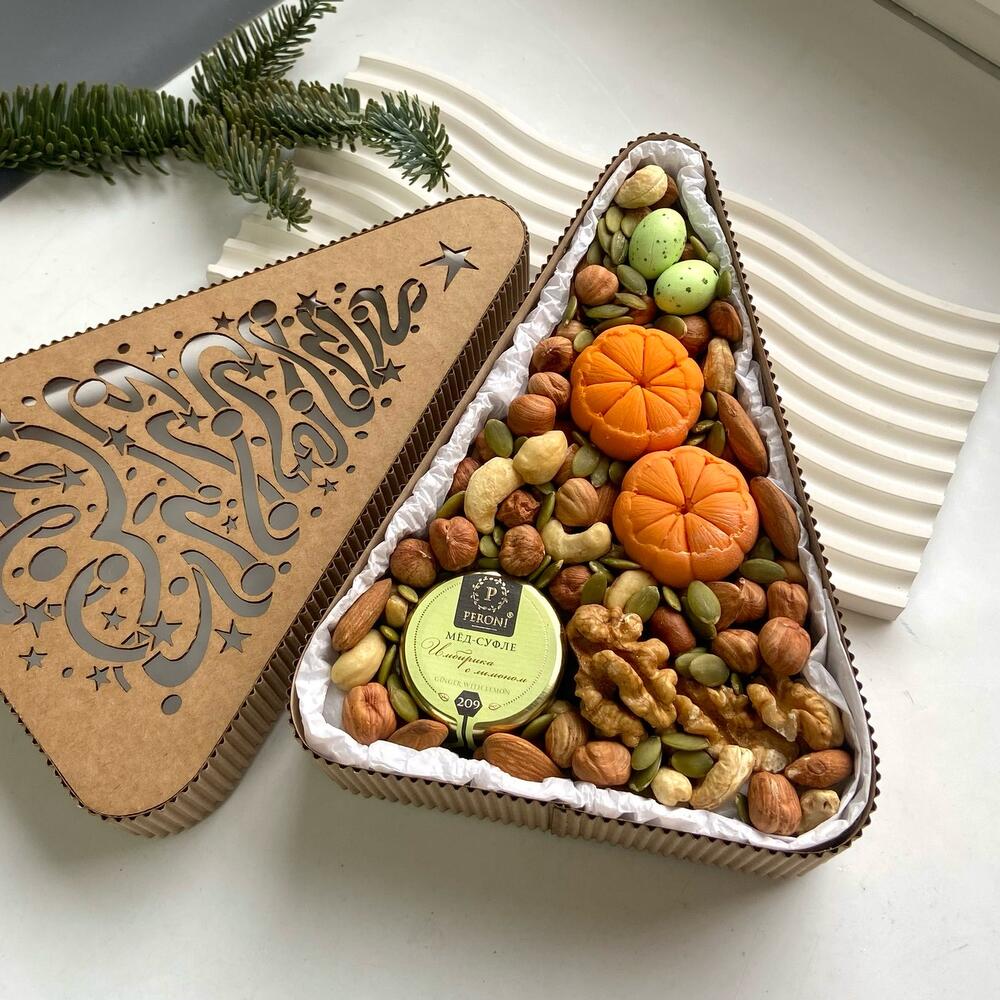 Walnut - 100 g Cashews - 30 g Almond - 100 g Hazelnuts - 100 g Dried apricots - 50 g Dates - 50 g the soufflé peroni honey 30 g - 1 pcs pumpkin seeds - 10 g коробка елочка с крышкой - 1 pcs мандрины с орехом из бельгийского шоколада callebaut 10 гр - 2 pcs