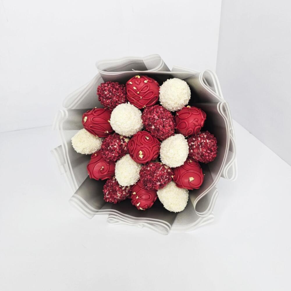 Coconut chips - 1 pcs Designer packaging - 1 pcs strawberries in Belgian chocolate - 19 pcs freeze-dried raspberries - 1 pcs a bow of satin ribbon - 1 pcs узоры ручной работы - 1 pcs