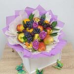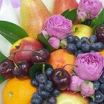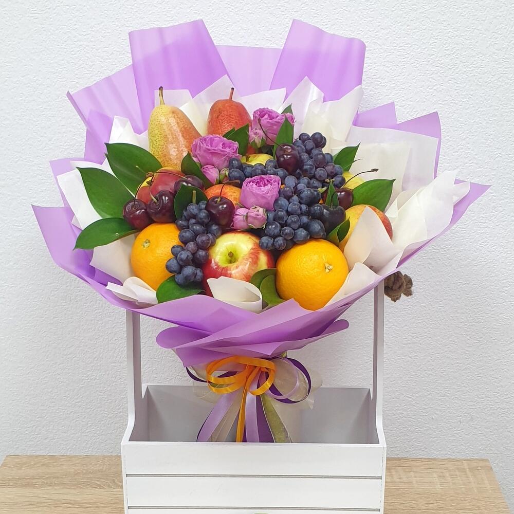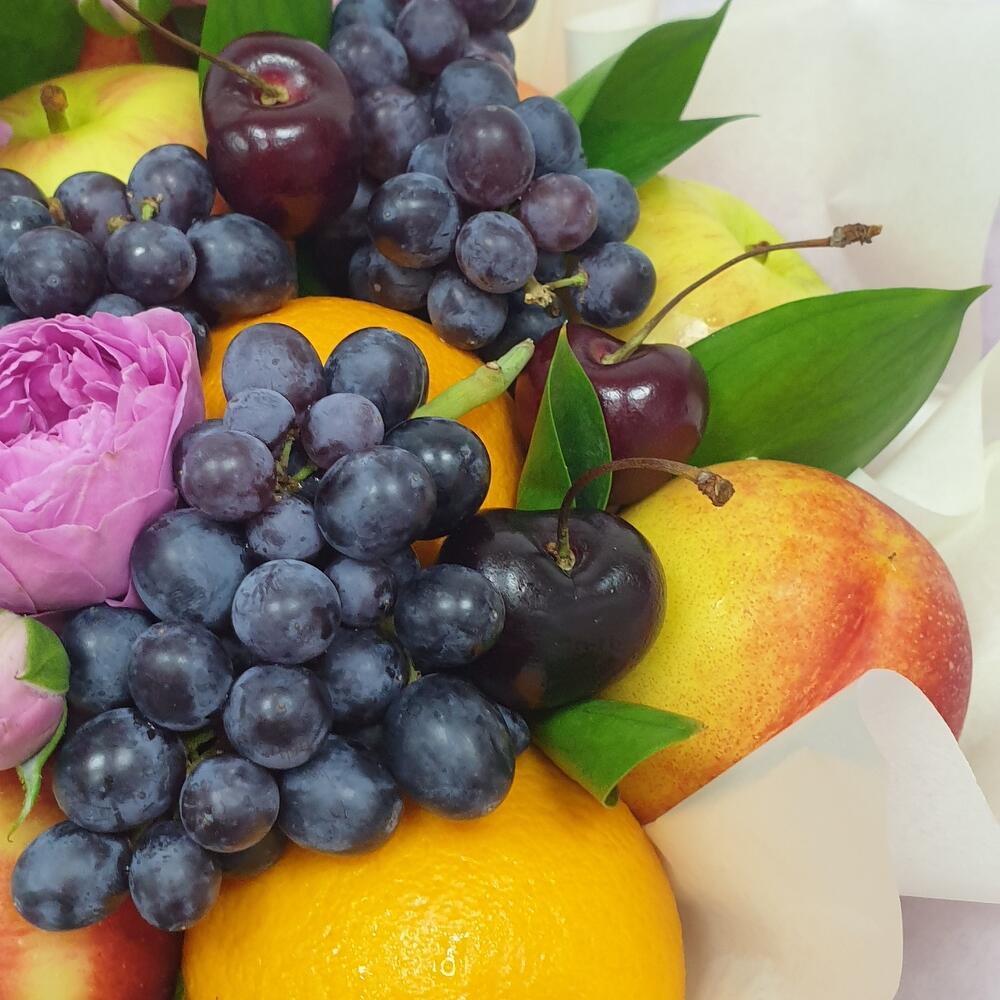 Красивый букет! Свежие и вкусные фрукты, но почему-то добавили две розы…