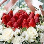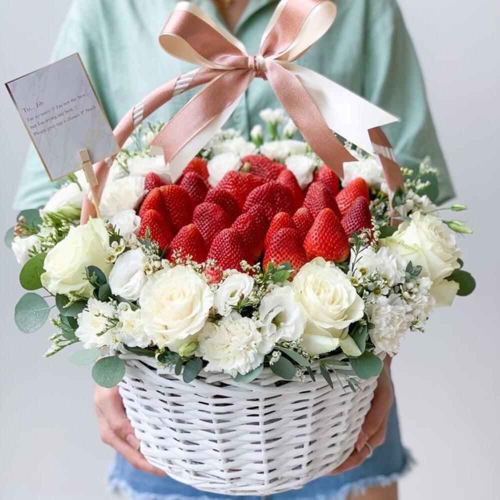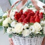 Strawberry - 20 pcs Lisianthus - 3 pcs Limonium - 3 pcs Chrysanthemum bush - 3 pcs Eucalyptus - 4 pcs Carnation - 7 pcs White rose - 7 pcs