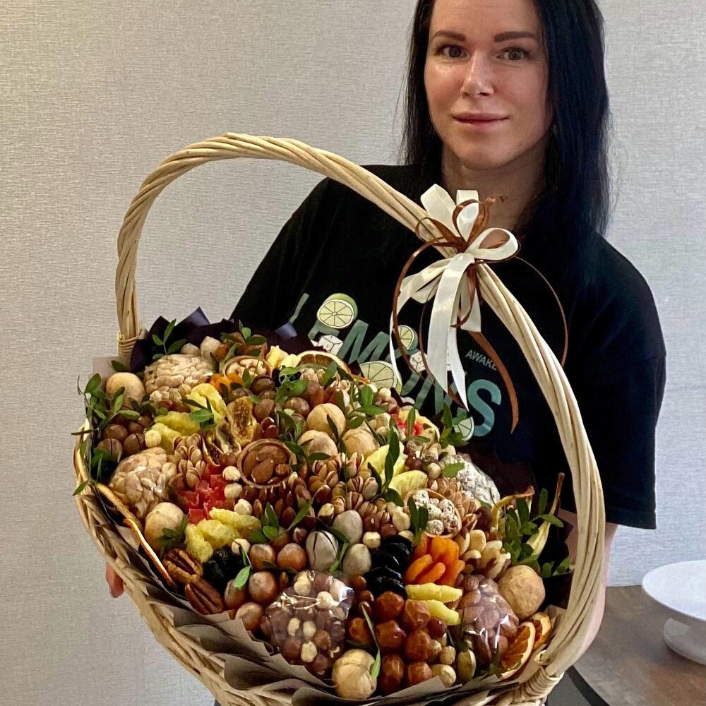 Корзина с орехами и сухофруктами Отправилась поздравлять начальника 😎 Диаметр 45 см В составе: пекан,кешью, макадамия, фундук,грецкий орех, арахис, арахис в кунжуте , бразильский орех, фисташки , миндаль , чернослив , курага, ананас , папайя, инжир, груша, финики