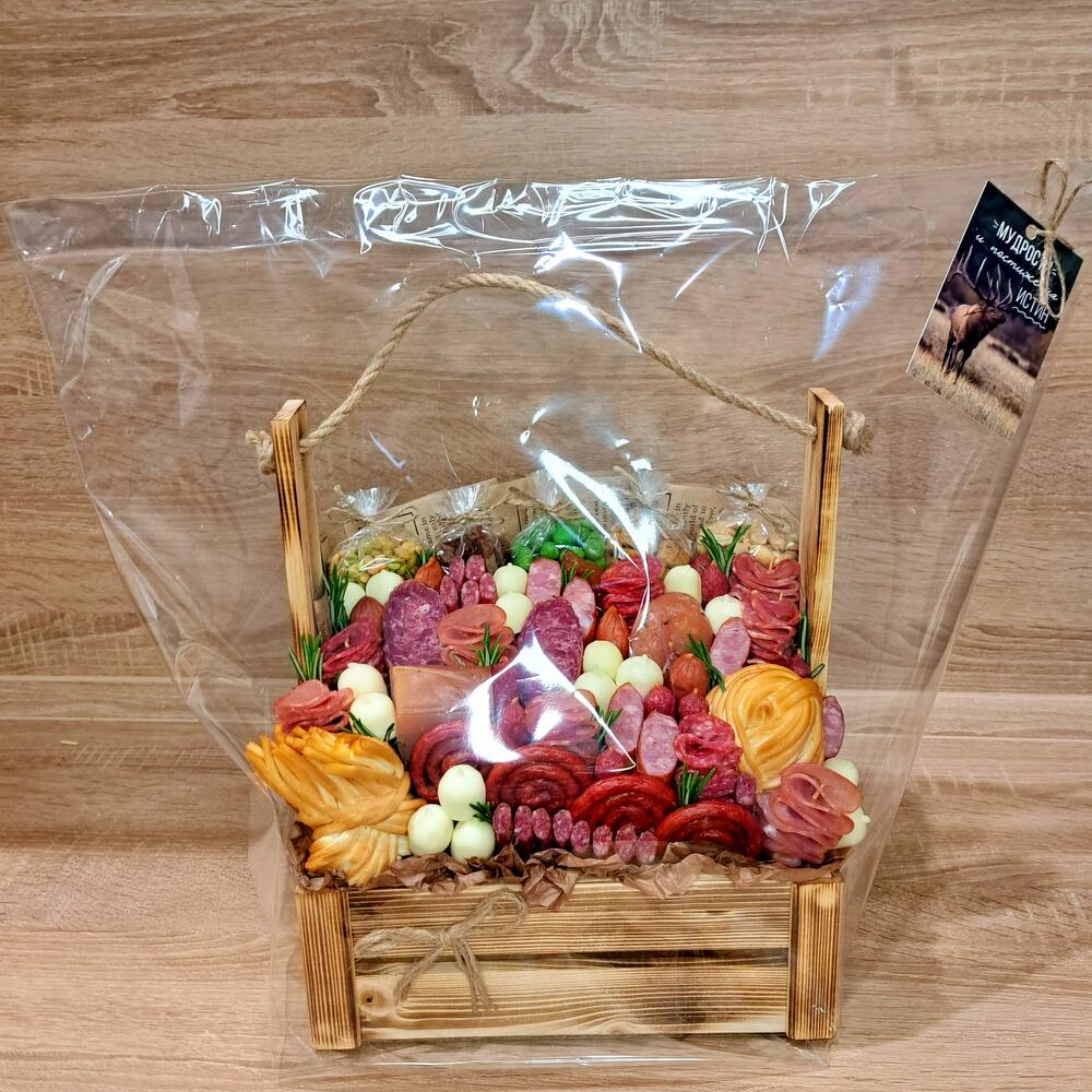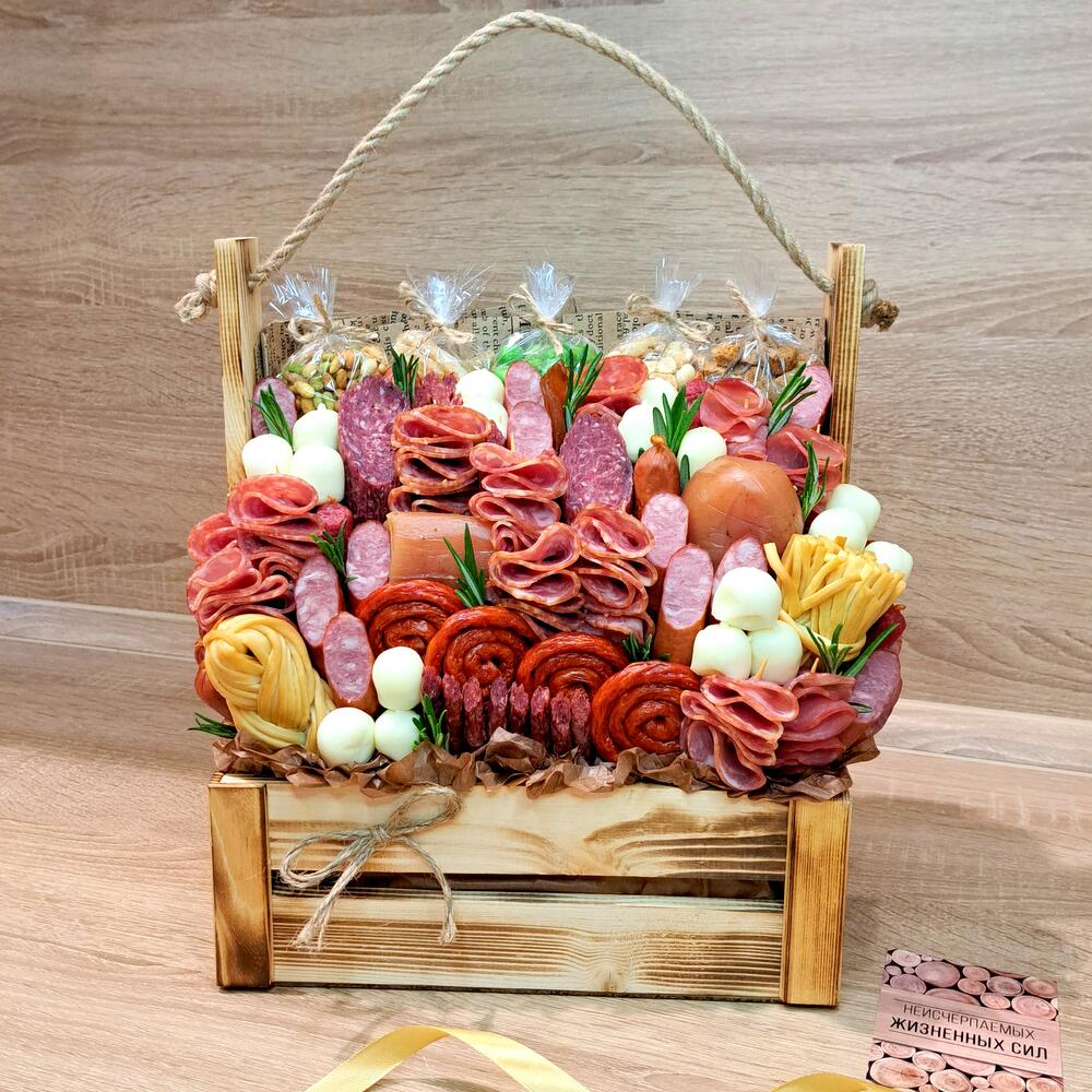Деревянный ящик с очень вкусным и ароматным сыро-колбасным наполнением. Здесь вы найдете различные сырокопченые колбаски, карпаччо из мяса цыпленка, снеки, копченый сыр косичка, сыр Scamorza. Композиция украшена свежей зеленью. Этот ящик станет отличным подарком для любого случая: будь то день рождения, юбилей, корпоративное мероприятие или просто знак внимания близкому человеку. Он не только порадует своим содержимым, но и удивит оригинальностью подачи. Не упустите возможность подарить незабываемые впечатления и наслаждение от вкуса!
