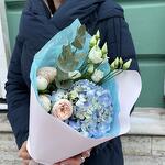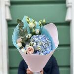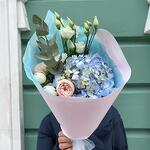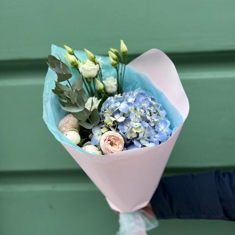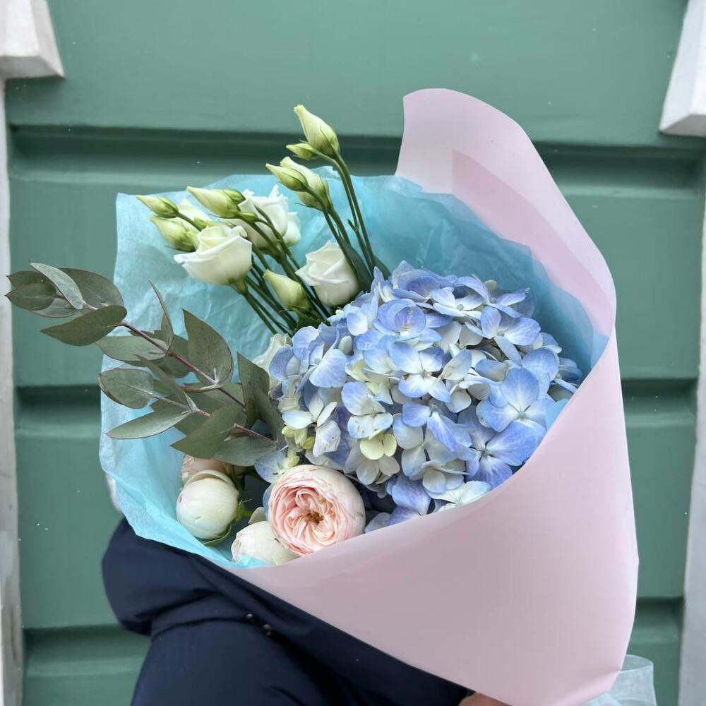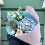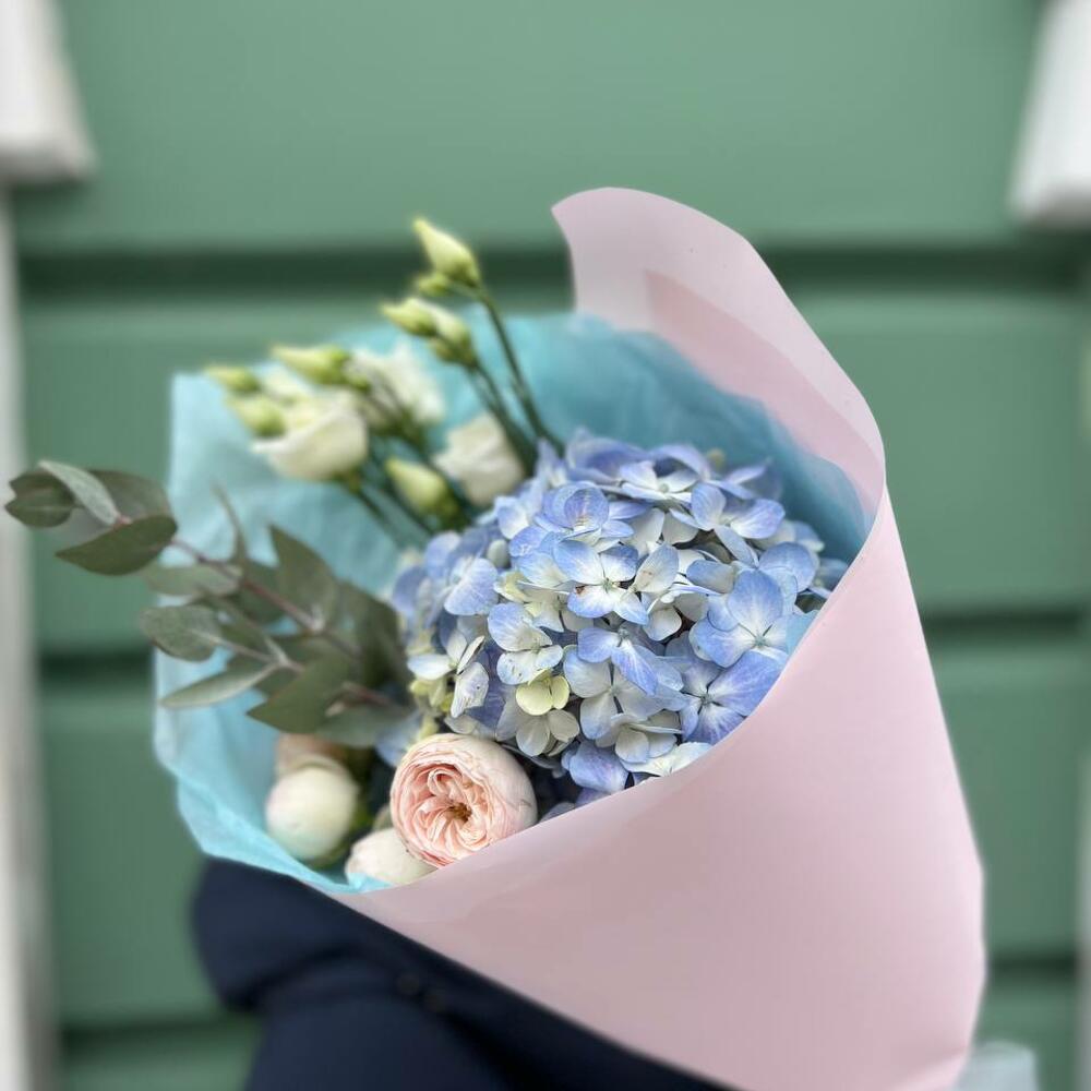 Eucalyptus - 1 pcs Eustoma - 2 pcs Silence - 1 pcs Tape - 1 pcs Blue hydrangea - 1 pcs Mansfield Park - 2 pcs