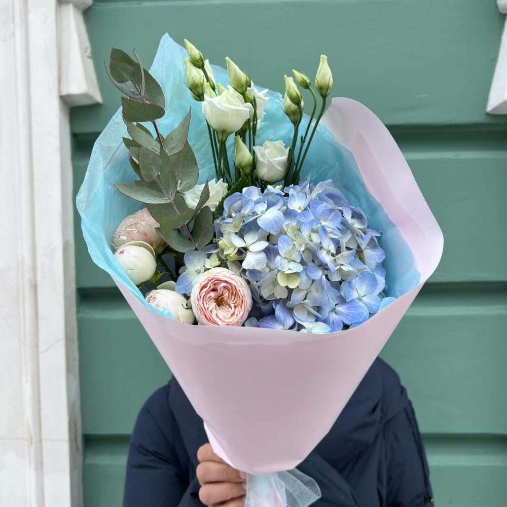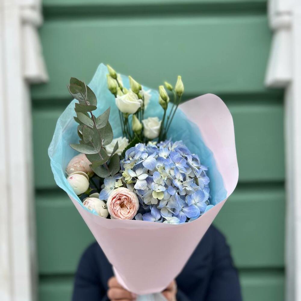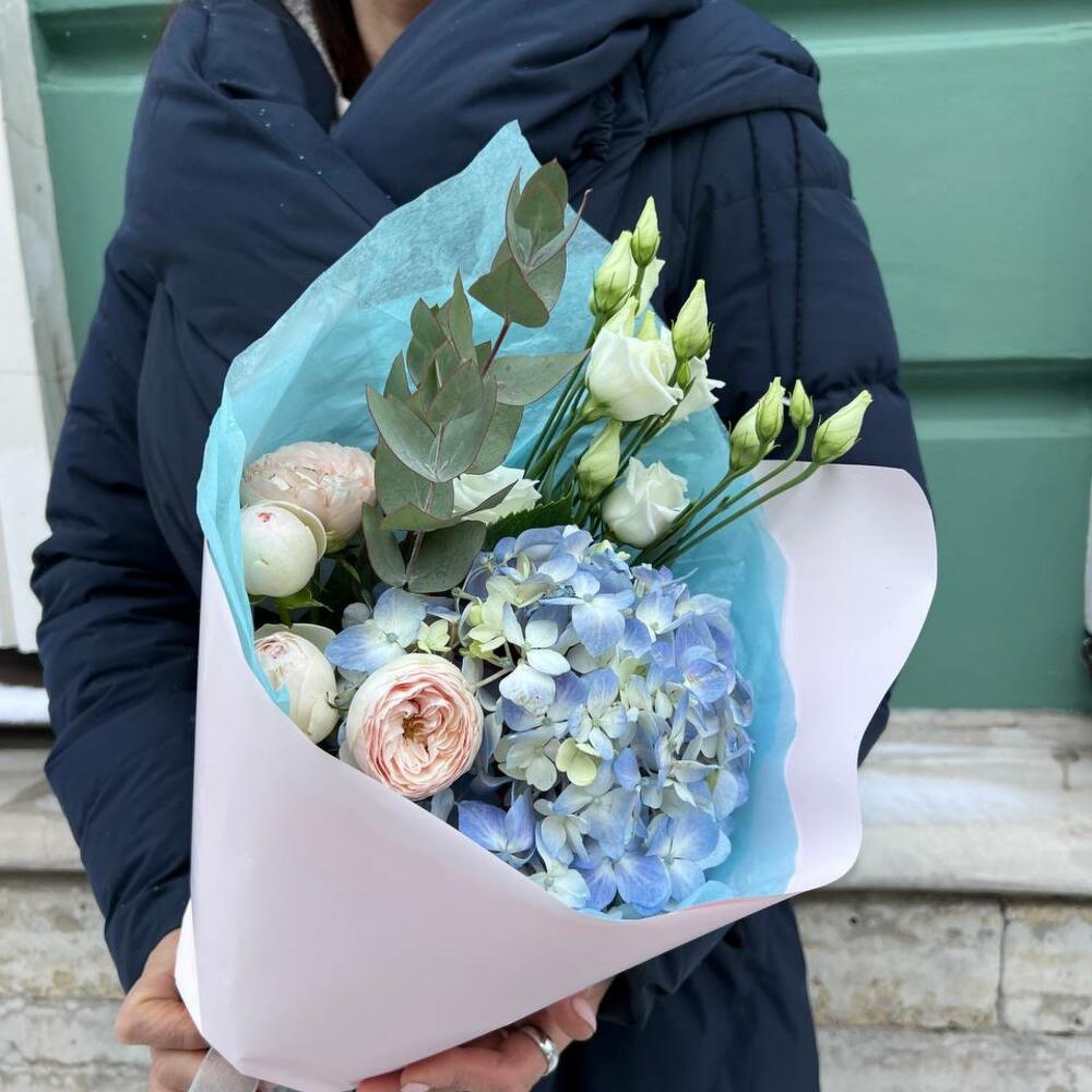Букет голубая гортензия, эустома, пион роза и эвкалипт (сб 055)