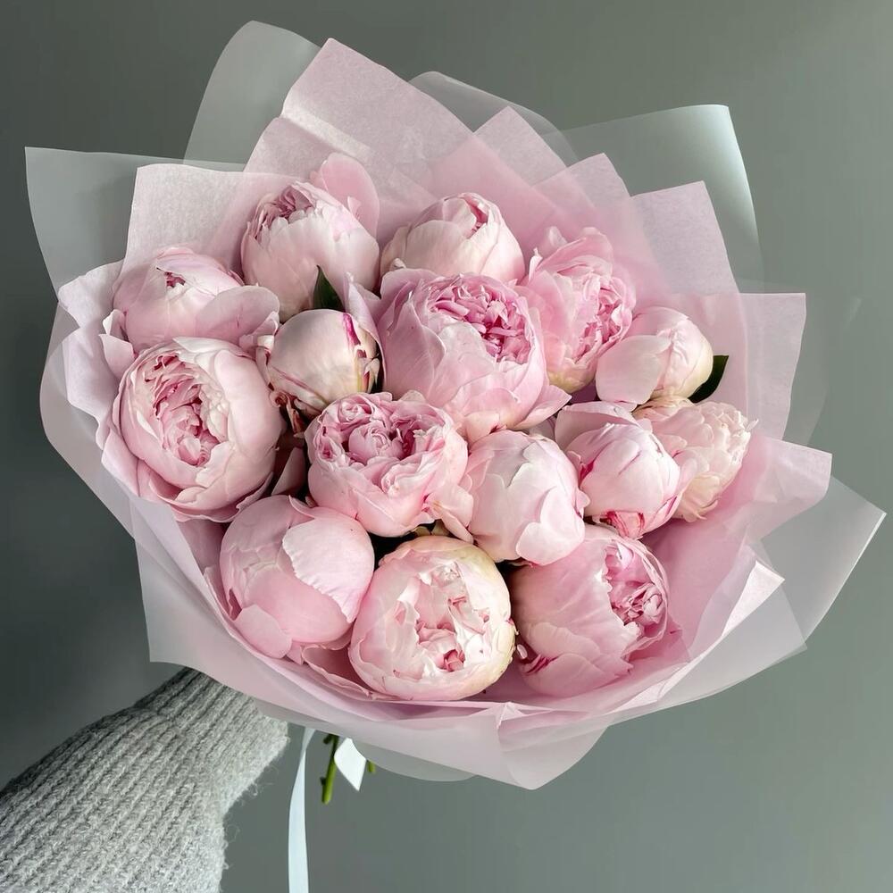 Нежные пионы сорта Сара Бернар в авторской упаковке с атласной лентой. Мы берем самые свежие цветы с нашего склада, в связи с этим наше время сборки букета чуть больше остальных, но зато вы получаете лучшие и самые свежие цветы.