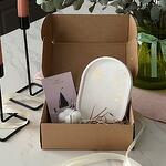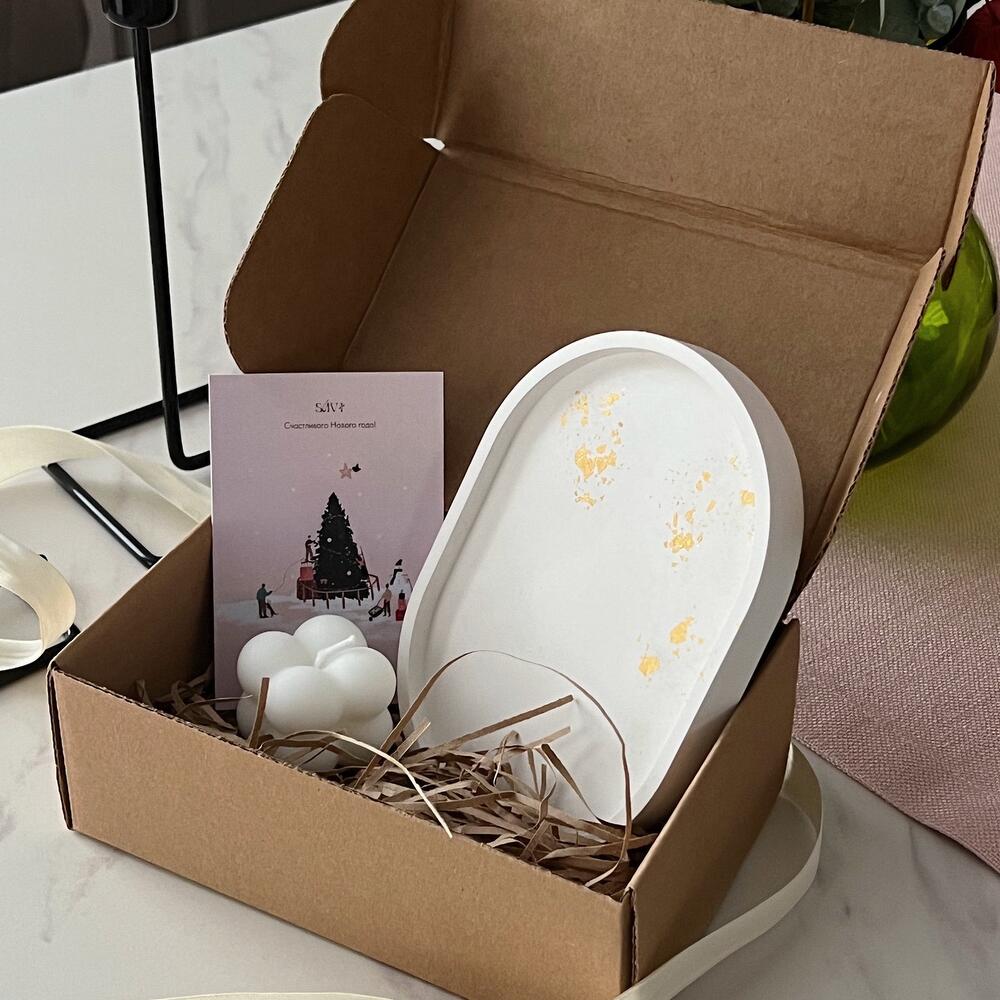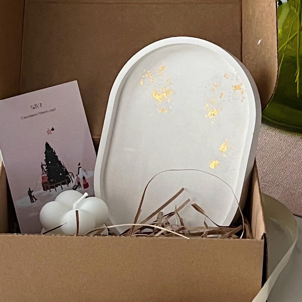 В состав набора входит: - овальная подставка из гипса с золотой поталью (15х10,5 см) - свеча из кокосового воска (4х4 см) Важно! Дизайн каждого изделия уникален, так как выполнен вручную - сделать точную копию невозможно Идея подарка на Новый год!