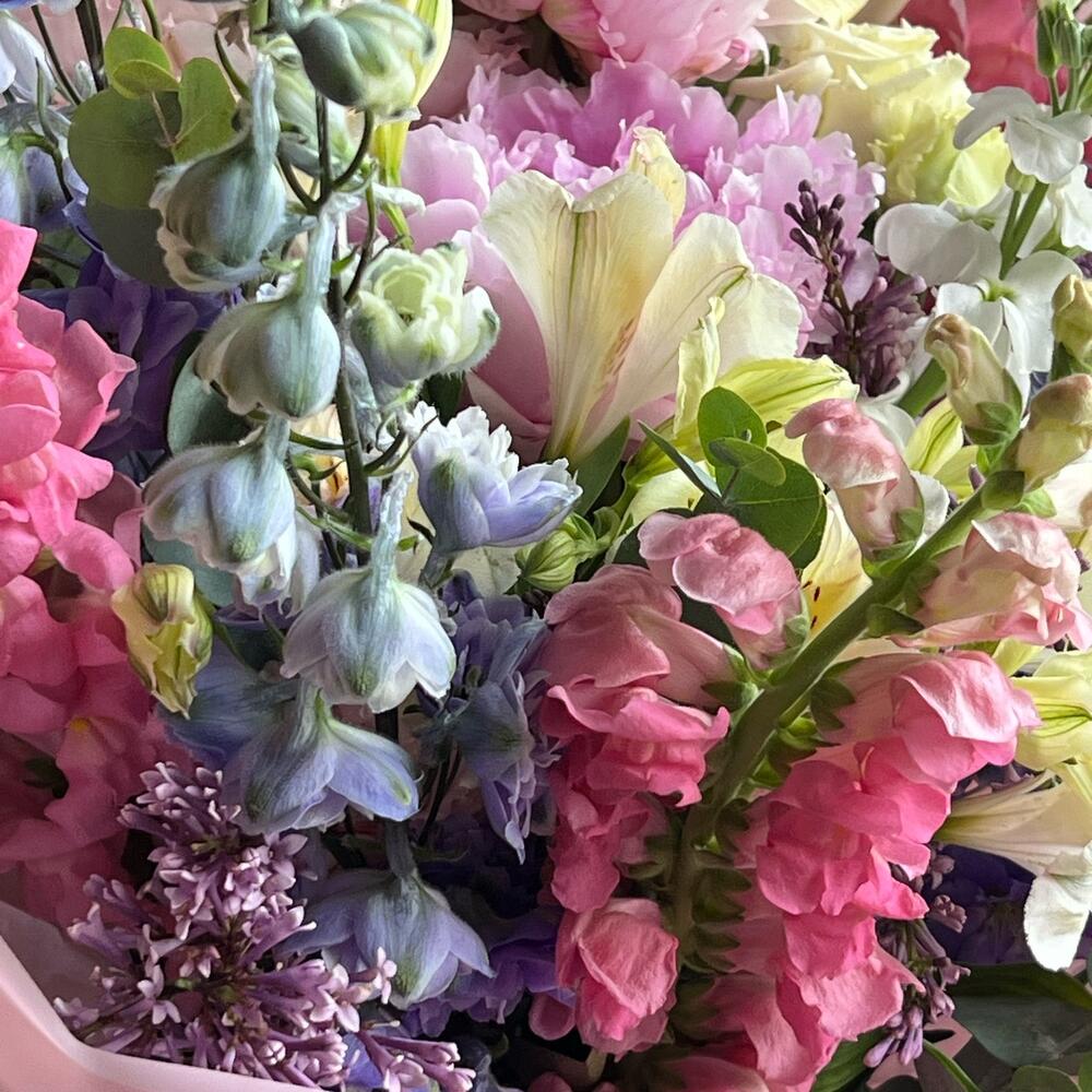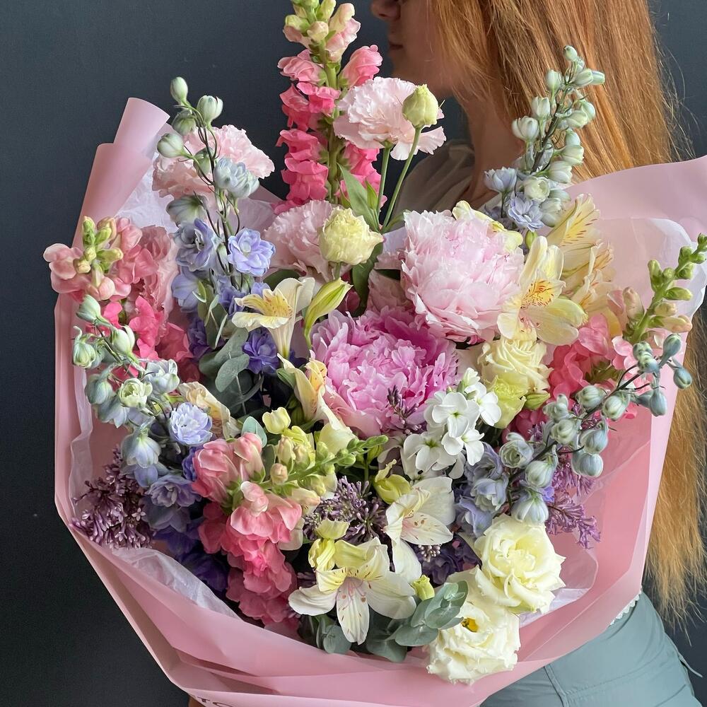 Alstroemeria - 3 pcs Delphinium - 4 pcs Matthiola - 3 pcs Eucalyptus - 1 pcs Eustoma - 3 pcs Pistachio - 2 pcs packaging design with ribbon - 1 pcs peonies by Sarah Bernhardt - 2 pcs antirrhinum pink - 4 pcs