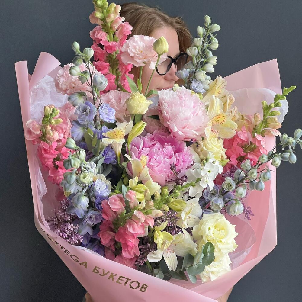 Premium bouquet of peonies, delphinium, antirynum, eustoma, alstroemeria "Sadovy vape"