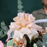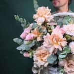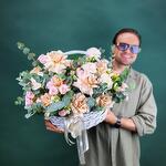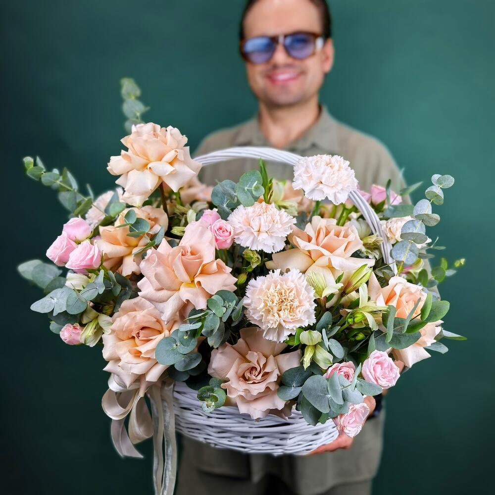 Эта цветочная корзина — воплощение нежности и утончённости. Нежные розовые и персиковые розы, словно облака, наполняют композицию теплом и мягкостью. Их бархатистые лепестки гармонично сочетаются с белоснежными хризантемами и альстромериями, создавая ощущение уюта и изысканности. Зелёные листья эвкалипта добавляют свежести и природной гармонии, а аккуратная плетёная корзина подчёркивает элегантность букета. Этот букет словно создан для того, чтобы дарить радость и наполнять день светом. Правила ухода за цветочной композицией в флористической губке 1. Ежедневный уход Увлажнение губки: Каждый день проверяйте влажность губки. Если она подсохла, аккуратно добавьте воду, используя шприц или лейку с тонким носиком. Вода должна быть комнатной температуры. Удаление увядших цветов: Убирайте увядшие цветы и листья, чтобы композиция выглядела свежей. 2. Поддержание чистоты Очистка основания: Протирайте основание композиции влажной тряпкой, чтобы избежать скопления грязи. Обработка воды: Для предотвращения роста бактерий добавляйте в воду немного лимонной кислоты или таблетку аспирина. 3. Условия хранения Температура: Держите композицию в прохладном месте, вдали от прямых солнечных лучей и отопительных приборов. Влажность воздуха: Избегайте слишком сухого воздуха, так как это может ускорить увядание цветов. 4. Продление свежести Подрезка стеблей: Если в композиции есть живые цветы, слегка подрезайте их стебли каждые 2-3 дня. Использование флористических добавок: Добавляйте в воду специальные средства для продления жизни цветов. 5. Общие рекомендации Не ставьте композицию рядом с фруктами, так как они выделяют этилен, ускоряющий увядание. Регулярно проветривайте помещение, где находится композиция. Следуя этим рекомендациям, вы сможете сохранить красоту и свежесть вашей композиции на долгое время!