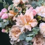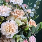 Alstroemeria - 8 pcs Bush rose - 9 pcs Eucalyptus - 5 pcs Rose - 13 pcs Carnation - 10 pcs Basket wicker - 1 pcs