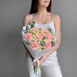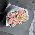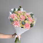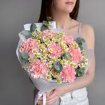 Розовый букет голландская ромашка матрикария, диантус розовая гвоздика и эвкалипт