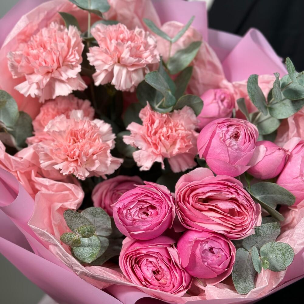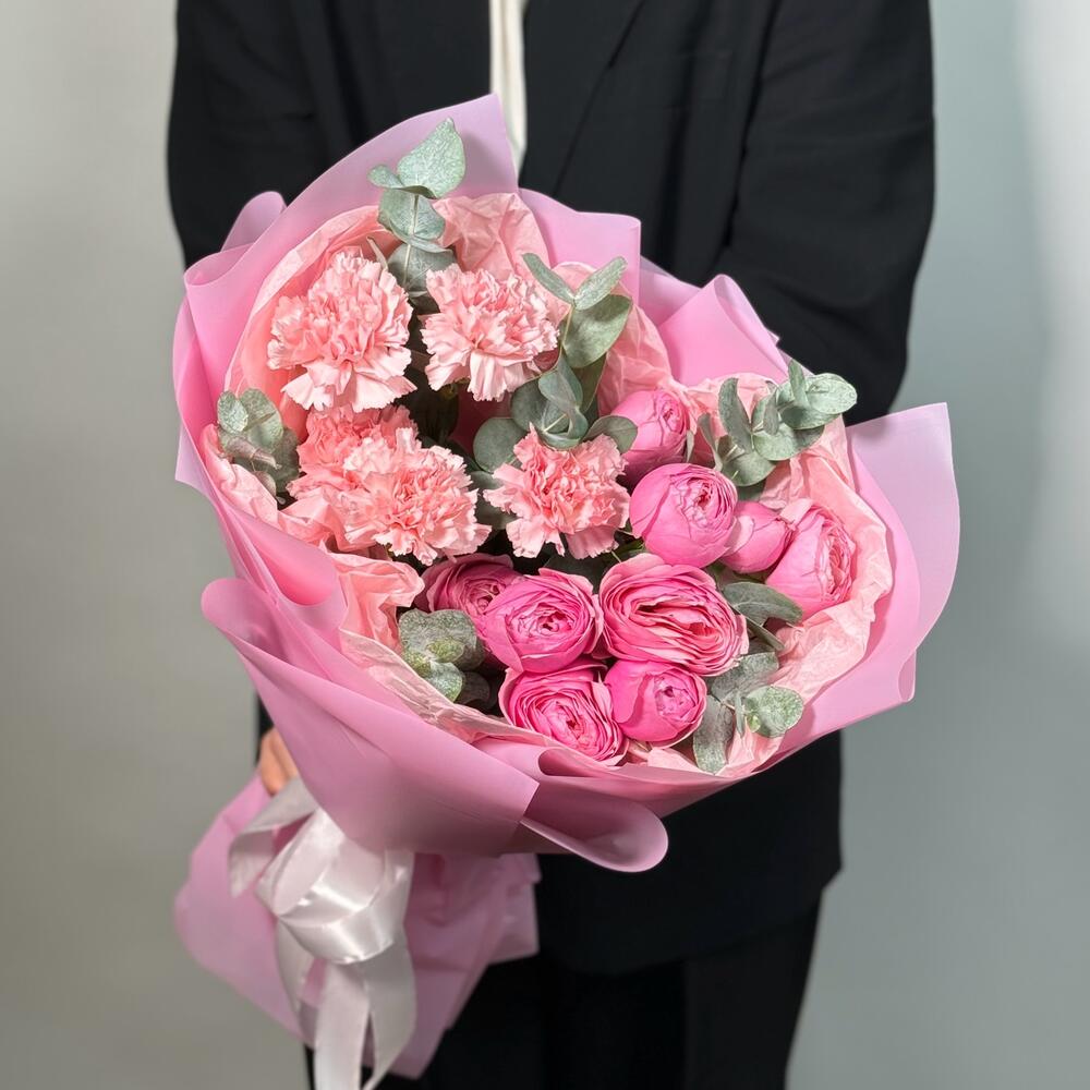 Eucalyptus - 2 pcs Silence - 2 pcs Satin Ribbon - 1 pcs Dianthus pink - 5 pcs matte color film - 2 pcs silva pink bush rose - 2 pcs