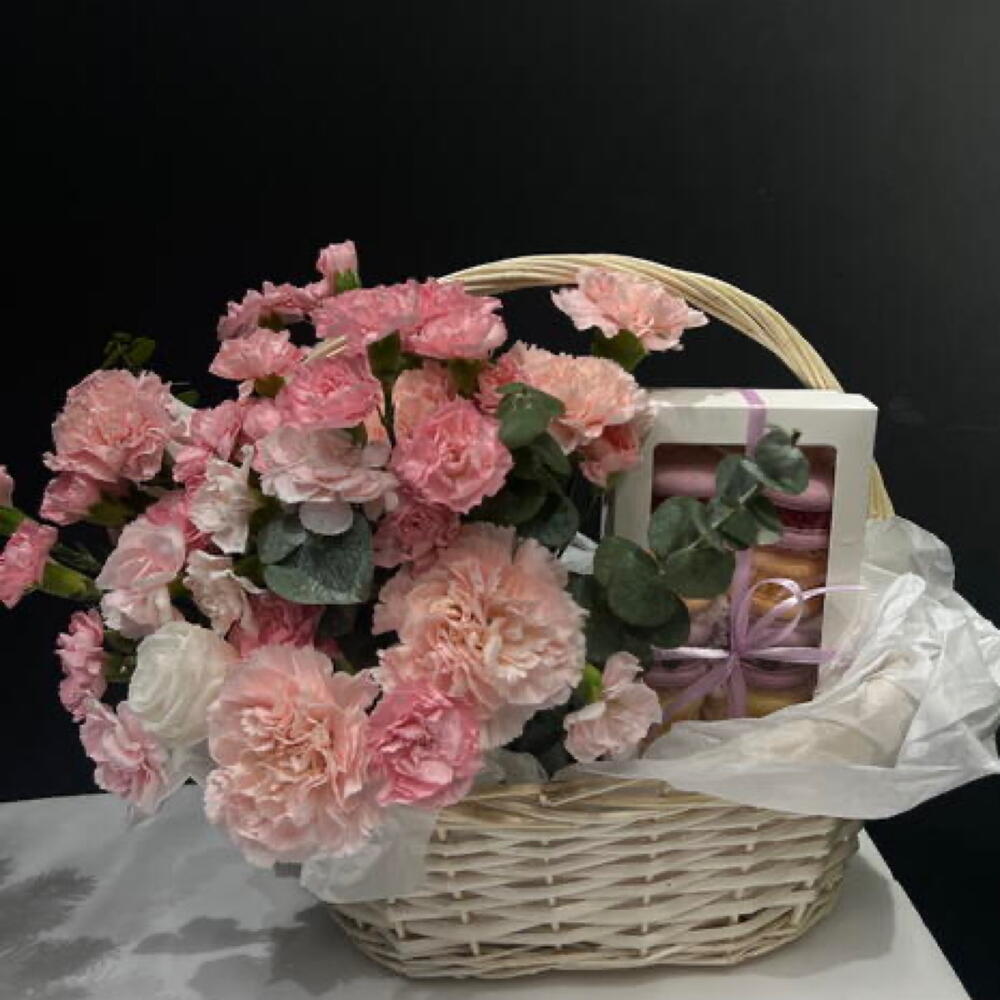 Basket - 1 pcs Dianthus - 21 pcs Eucalyptus Mix - 6 pcs macaron (cake) - 10 pcs