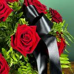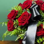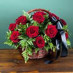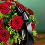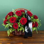 Эта траурная композиция — символ уважения и скорби. Плетёная корзина с красными розами сорта Эксплорер подчёркивает траурность момента. Чёрная атласная лента добавляет строгости и подчёркивает значимость события. Розы в оазисе остаются свежими, что позволяет сохранить их красоту в течение всего траурного мероприятия.