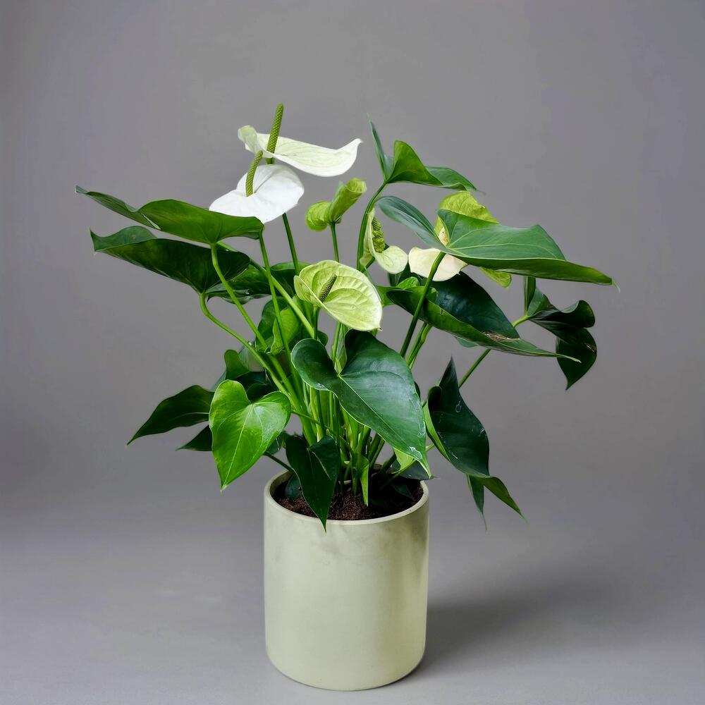 Антуриум Белый - Рико ("Мужское счастье"); в светло-зелёном круглом керамическом горшке