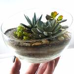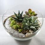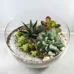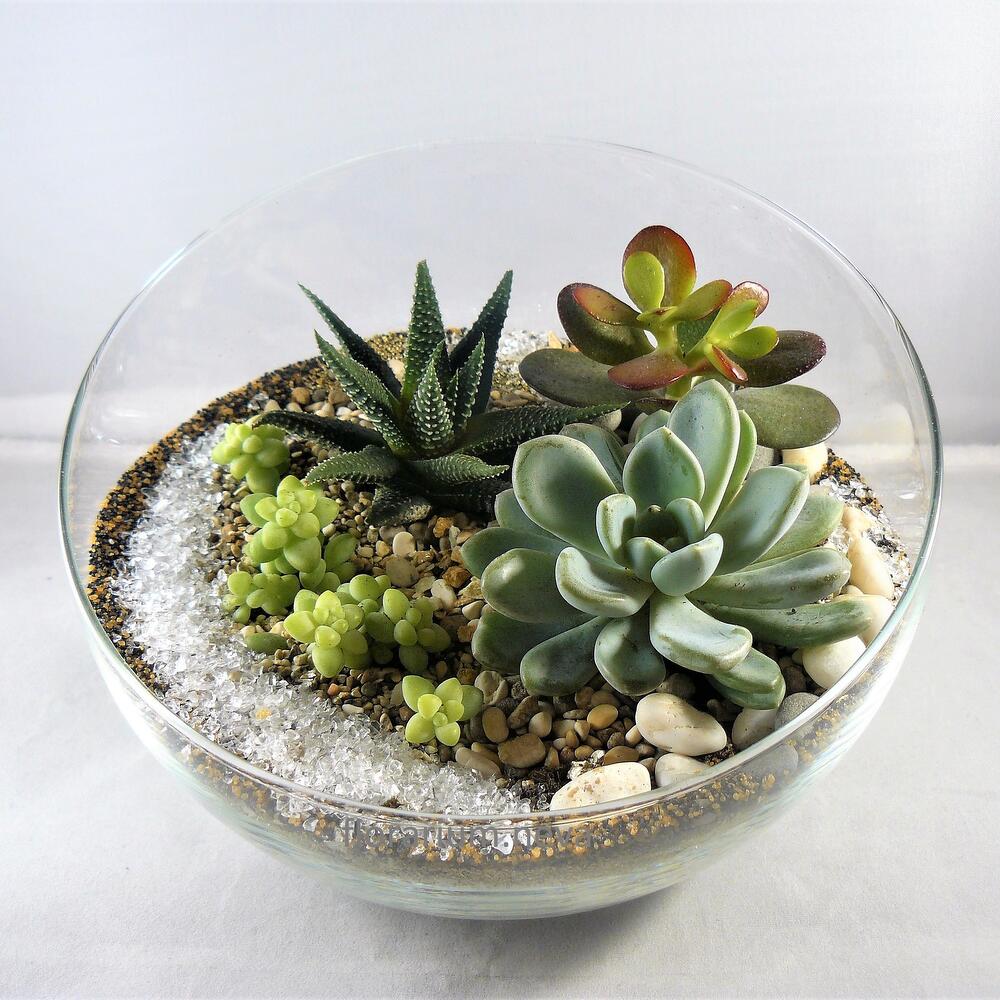 Флорариум с композицией из суккулентов в оформлении камушков псевдоалмазов. Усеченная ваза D 16 см Флорариум необычайно красив как украшение дома и в качестве подарка с самыми чудесными пожеланиями. Фото представлены для примера, растения подбираются похожими, основа композиции сохраняется. Если вы хотите видеть флорариум с другими растениями, напишите нам. При заказе учитываются ваши пожелания. Флорариум упаковывается в подарочную бумагу и коробку. Рекомендации по уходу и поливу прилагаются.