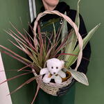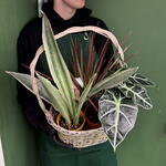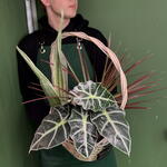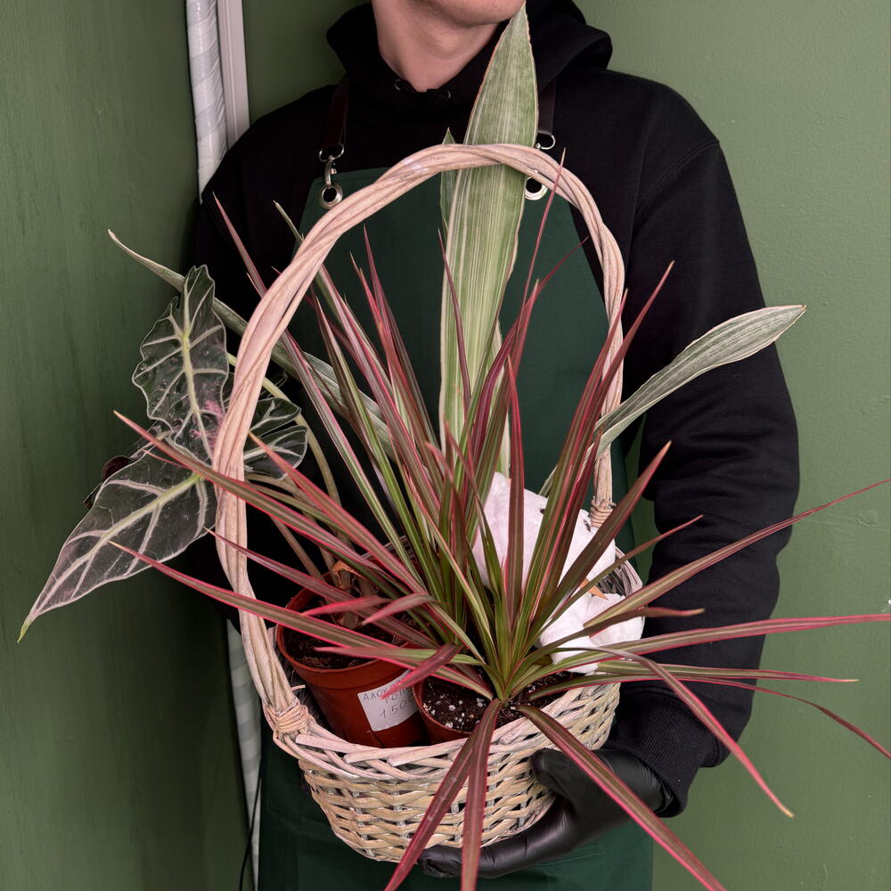 Корзинка с растениями подарочная: -Драцена Неприхотливое растения семейства пальмовых, полив по мере просыхания грунта, опрыскивание водой, рассеянный свет -Сансевиерия серебристая Самое неприхотливое растения, которое еще и фильтрует воздух, полив раз в месяц, освещение не важно, может расти и в ванной, но лучше больше света -Алоказия Полли Тропическая красавица нуждается в поливе раз в 3 дня +-, регулярном опрыскивании, любит солнце, рассеянный свет