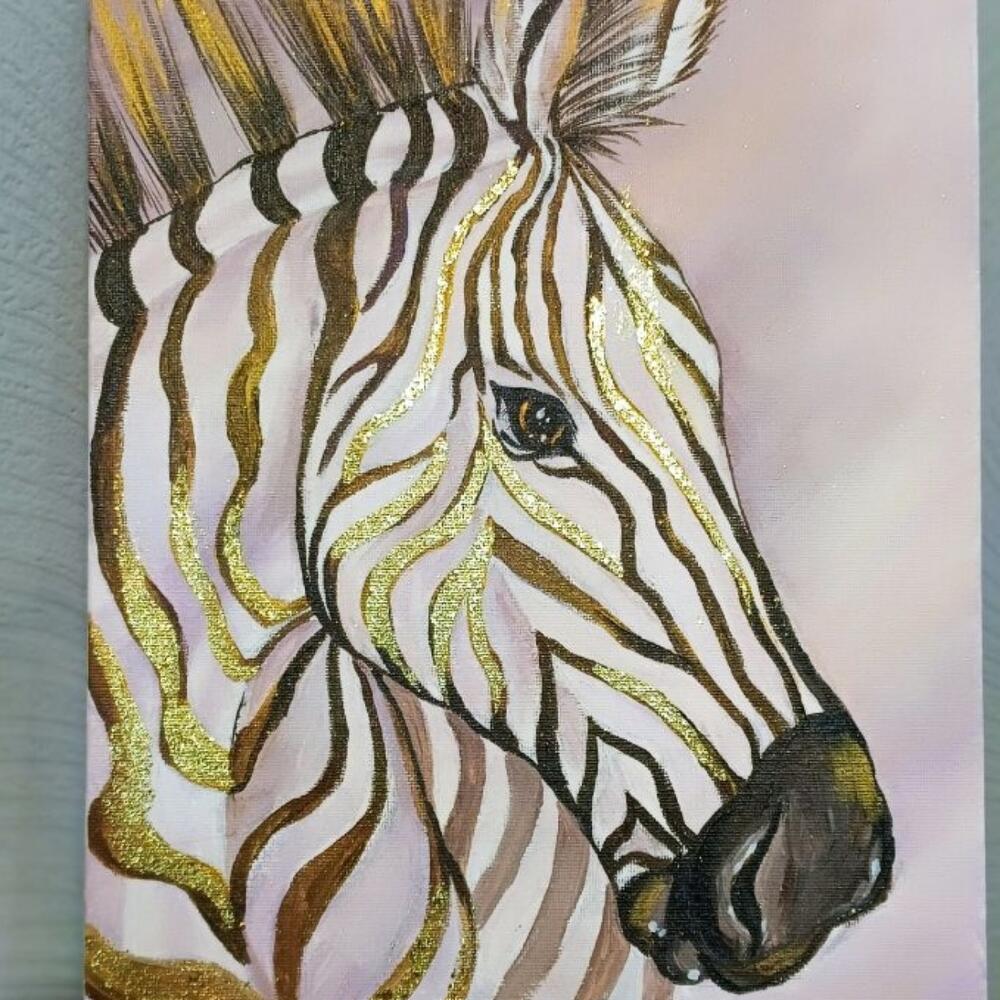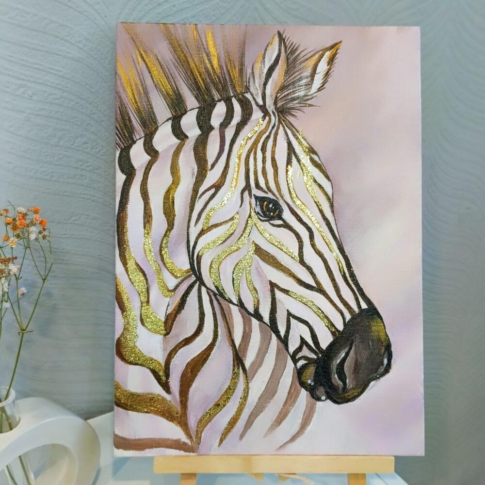 Интерьерная стильная картина с зеброй в современном стиле с элементами золочения. Очень красиво блестит и переливается. Украсит интерьер вашей квартиры, дома или подойдёт в качестве подарка!