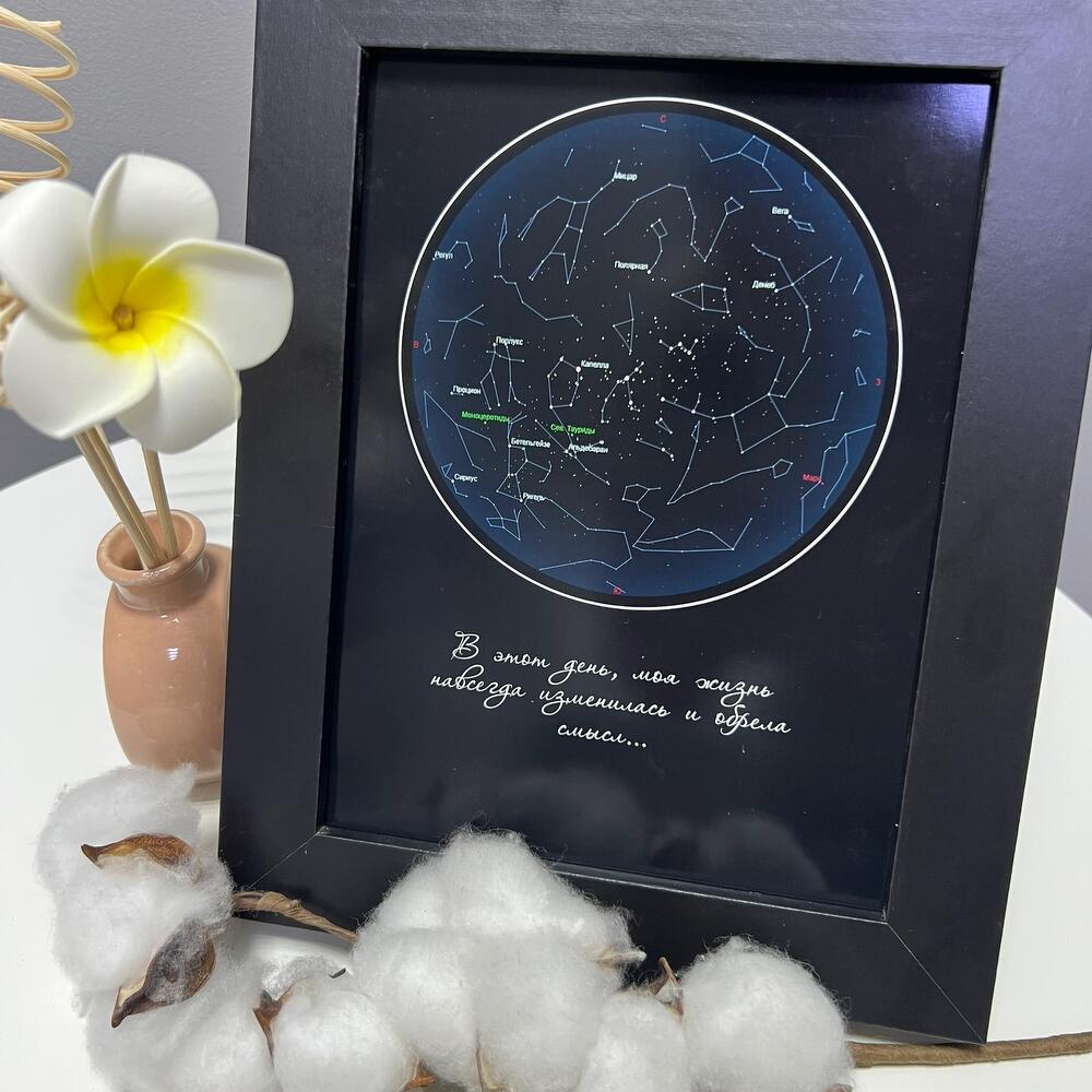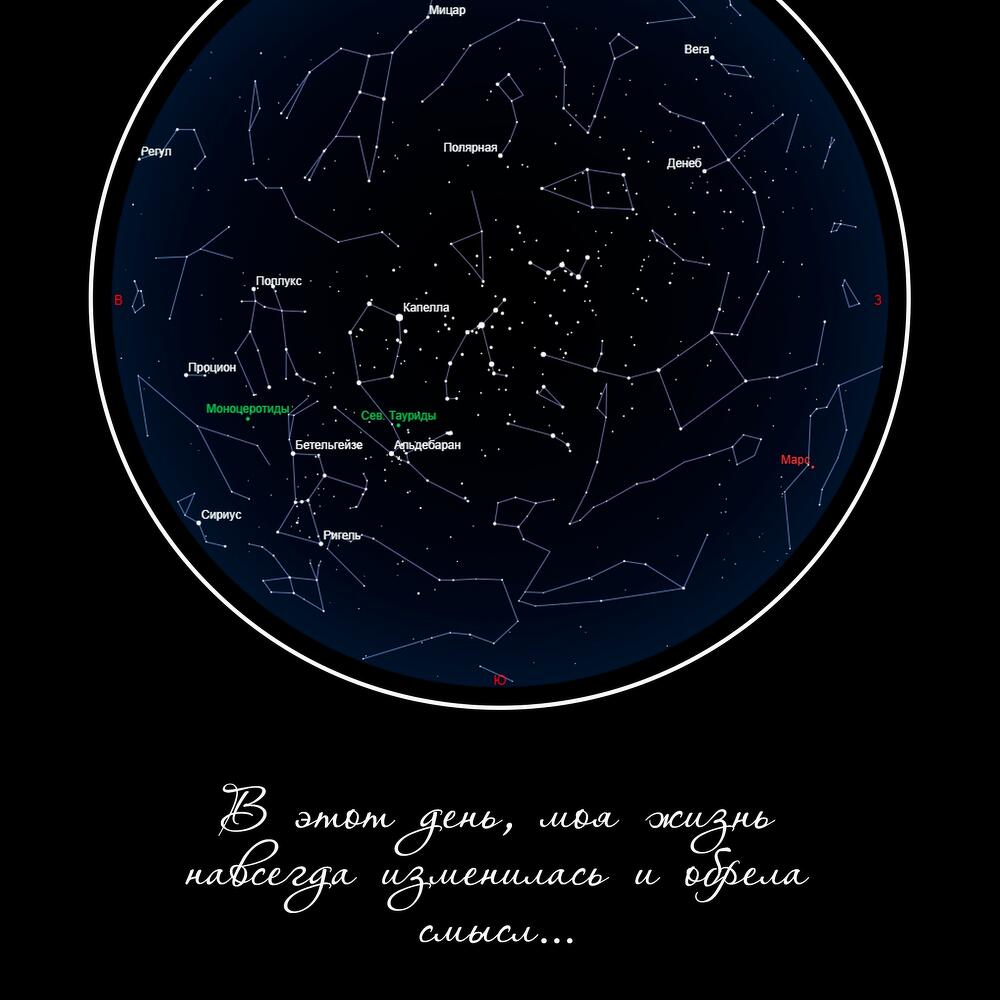 Электронная карта с расположением звезд на момент вашей встречи, свадьбы или другой памятной даты. Если Вам необходим распечатанный вариант карты, можно забрать самовывозом - без дополнительной платы, если нужна доставка на адрес - будет выставлен дополнительный счёт за доставку.