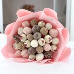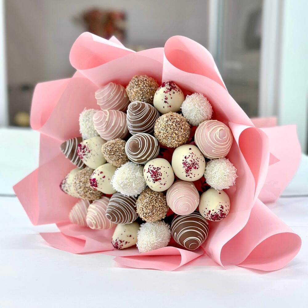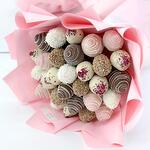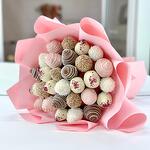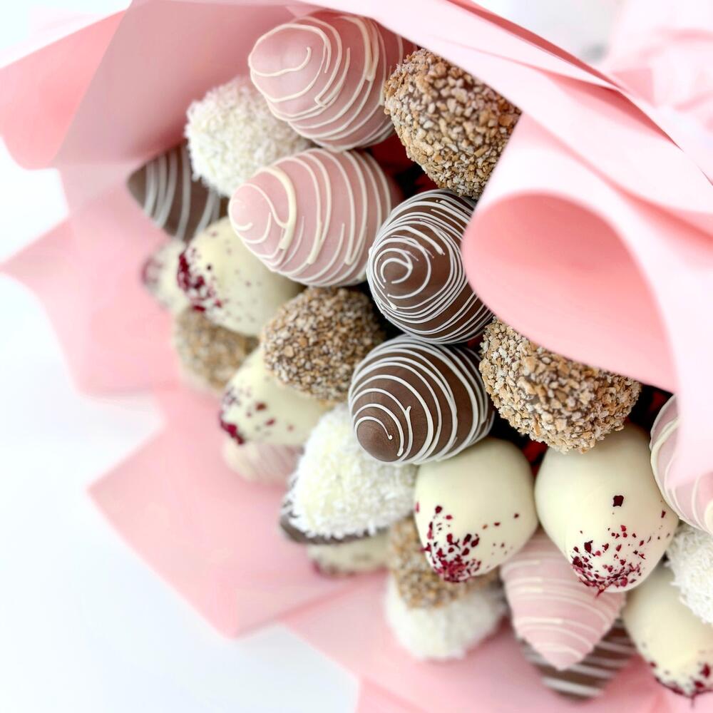 Букет размера S из клубники (400 гр) в белом, розовом и молочном шоколаде премиум-класса. Украшен шоколадным узором, вафельной крошкой, кокосовой стружкой и сушеной розой.